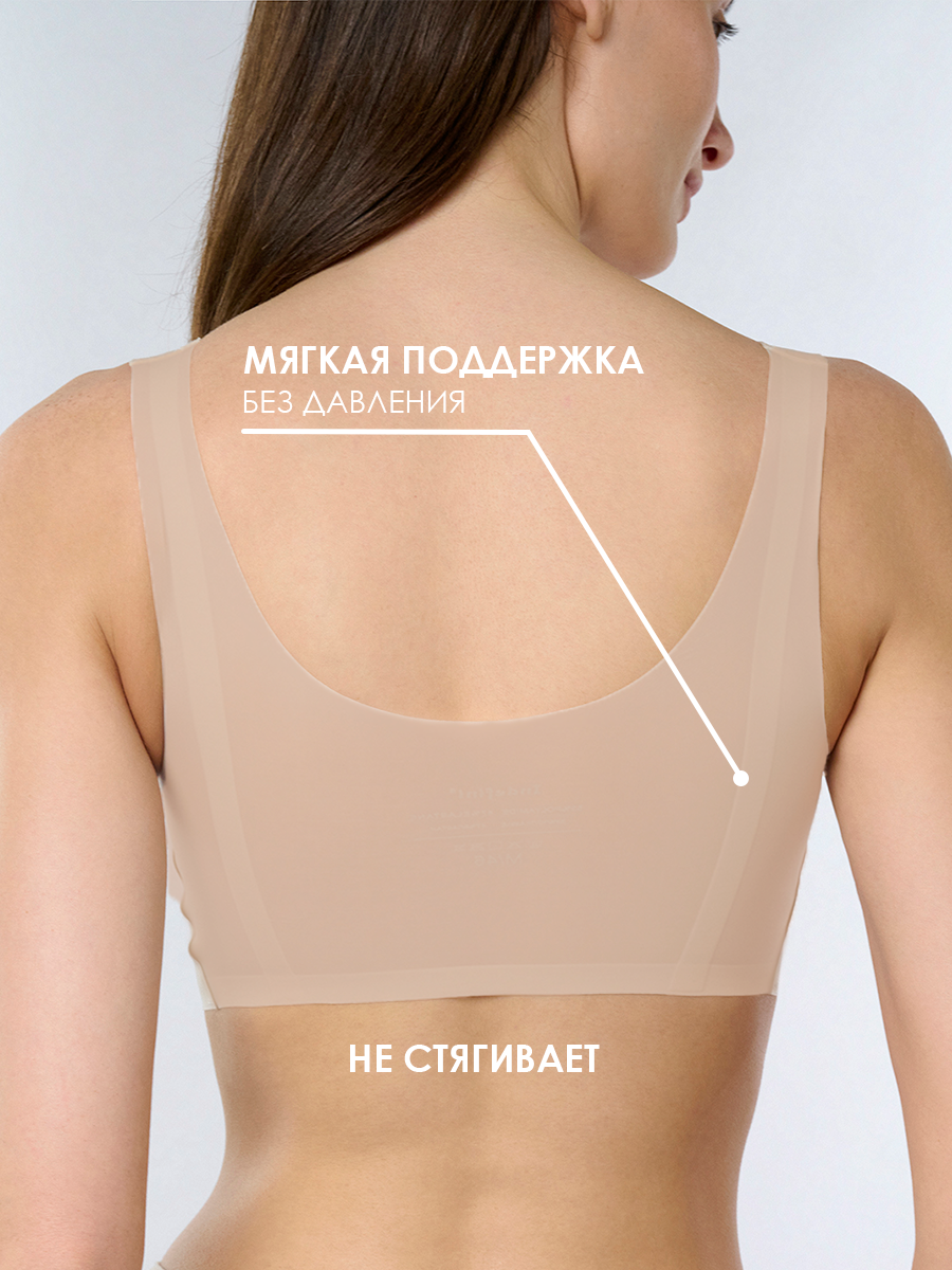 Современный бежевый бюстгальтер выполнен из мягкого эластичного материала, обеспечивающего комфортную посадку и свободу движений. Модель не имеет каркасных косточек и застёжек, что делает её максимально удобной для повседневной носки.
