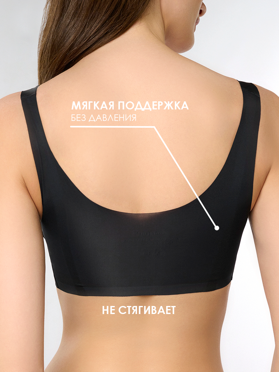 Современный чёрный бюстгальтер выполнен из мягкого эластичного материала, обеспечивающего комфортную посадку и свободу движений. Модель не имеет каркасных косточек и застёжек, что делает её максимально удобной для повседневной носки.