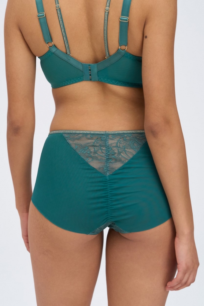 Трусики классические с высокой талией из коллекции Chiara выполнены в насыщенном летнем зелёном цвете с глубокими голубыми оттенками из кружевного полотна, продублированного телесной сеткой, спинка из сетки, сложенной вдвое, с V-образной вставкой кружева, на спинке вертикально присборены. Ластовица проложена 100% хлопком. Золотая люрексовая нить проходит через всю коллекцию, добавляя ей утончённого блеска и благородства.