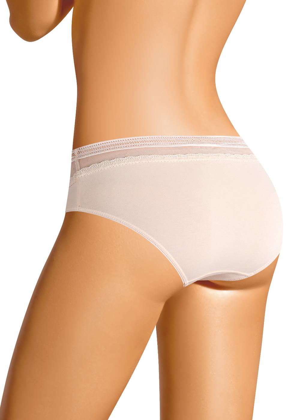 Трусы-бикини женские из эластичного хлопкового полотна. Спереди вставка из сетки с узким кружевом. Обработка краев по талии - сеткой с ажурной широкой резинкой, по ноге - узкой окантовкой.