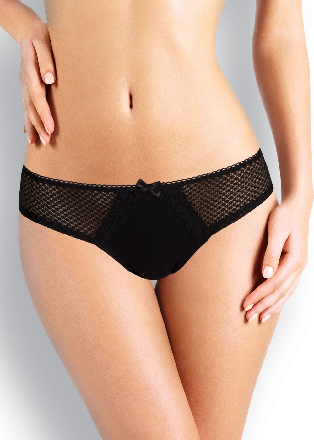 Трусы бразилиано женские из эластичного хлопкового полотна. Спинка и вставки по бокам из эластичной сетки. Обработка краев - ажурная резинка с фестоном. Спереди узкое кружево и бант.