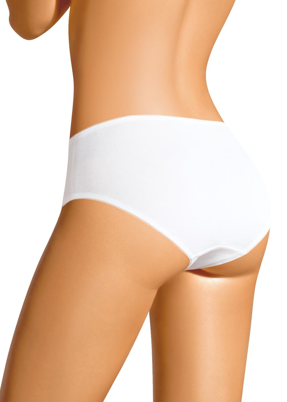 Трусы-слипы женские из эластичного хлопкового полотна. По переду резы и вставки из кружева. Обработка краев - ажурная резинка с фестоном.