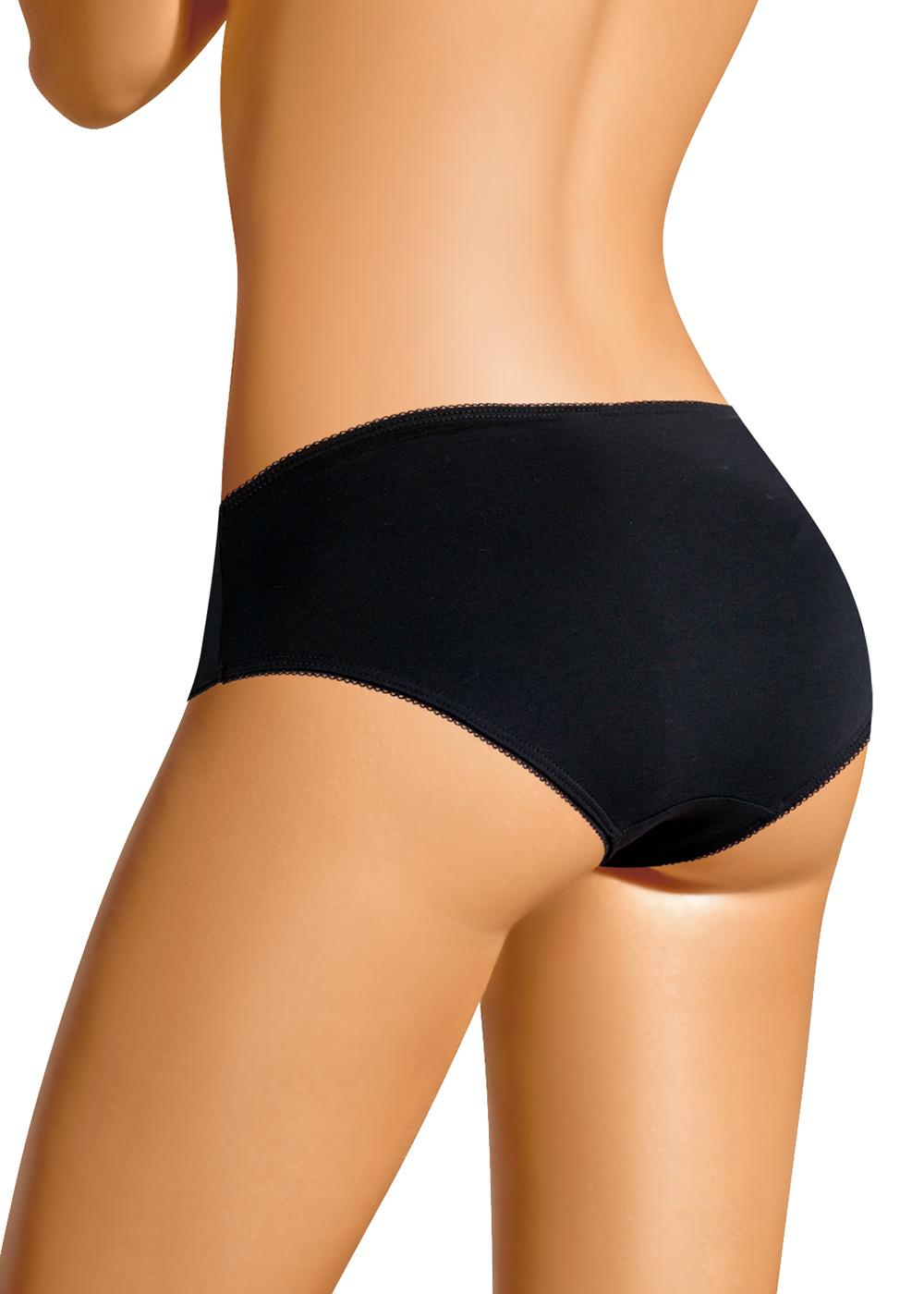 Трусы-слипы женские из эластичного хлопкового полотна. По переду резы и вставки из кружева. Обработка краев - ажурная резинка с фестоном.
