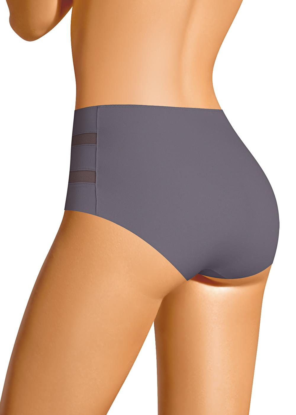 Трусы слипы с завышенной посадкой, сзади и сбоку бесшовная гладкая обработка, спереди декоративные горизонтальные вставки из плотной сетки, перед дублирован сеткой, по талии обработка с зигзагом и узкой резинкой.