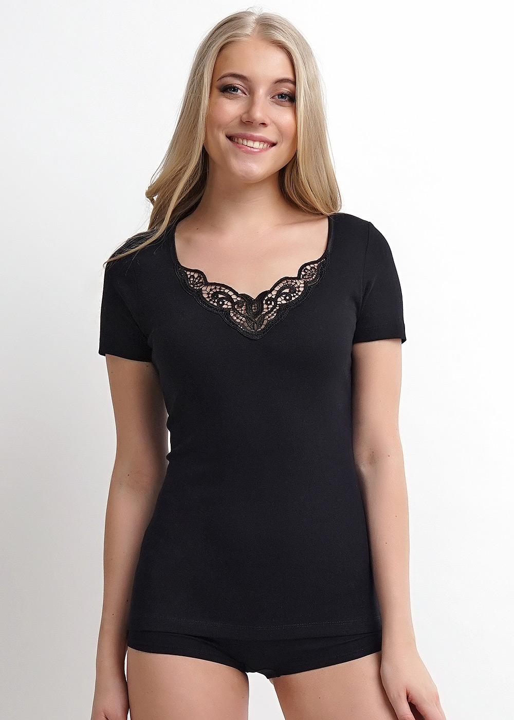 Фуфайка женская по фигуре из рибаны. Втачной короткий рукав. V-образный вырез горловины декорирован кружевной вставкой.