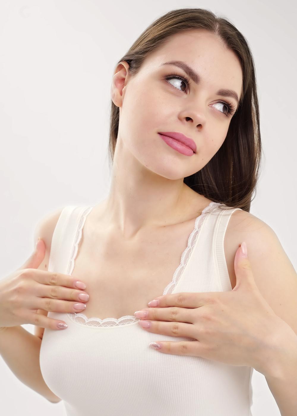 Майка для дома и отдыха из вискозного трикотажного полотна кашкорсе лапша. Среднее плечо. Округлый вырез горловины. По горловине узкое кружево, по пройме обтачка.