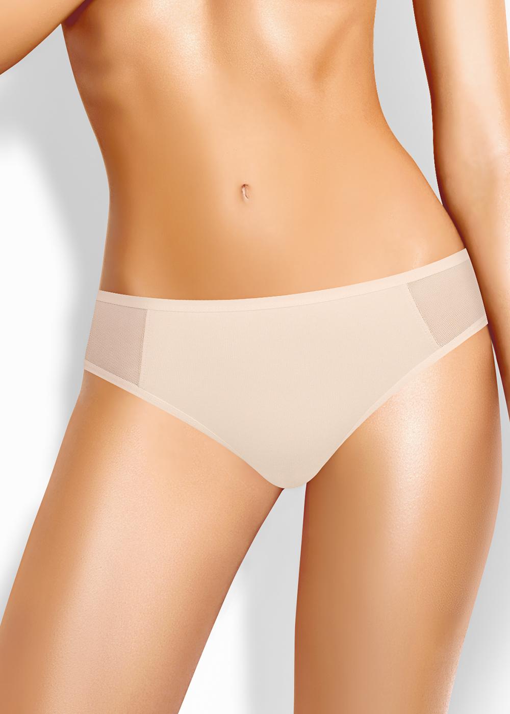 Трусы стринги женские из эластичного хлопкового полотна. Обработка краев по талии - жаккардовая резинка, по ноге - полуокантовка. Спереди боковые вставки из сетки.