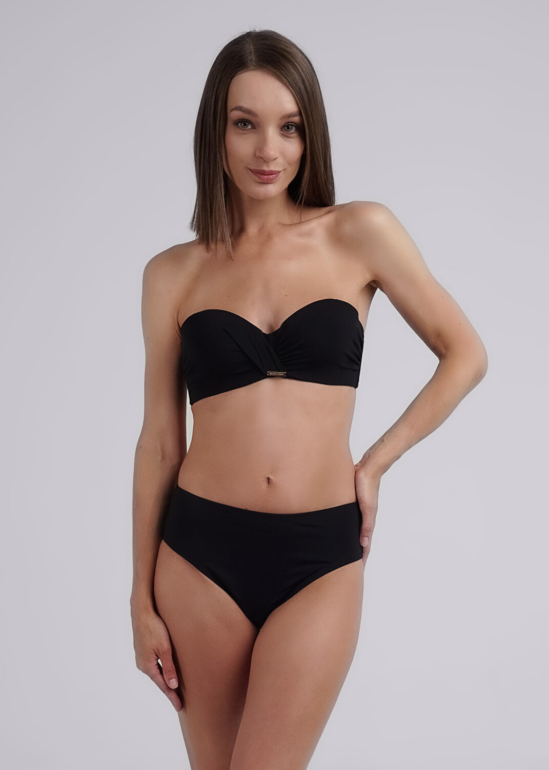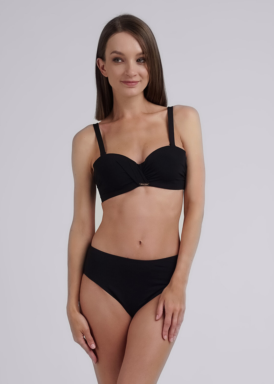 Костюм купальный женский однотонный из полиамида с эластаном. Лиф с круглыми чашечками, с декоративными складками спереди, на регулируемых бретелях. Трусы бикини на высокой посадке.