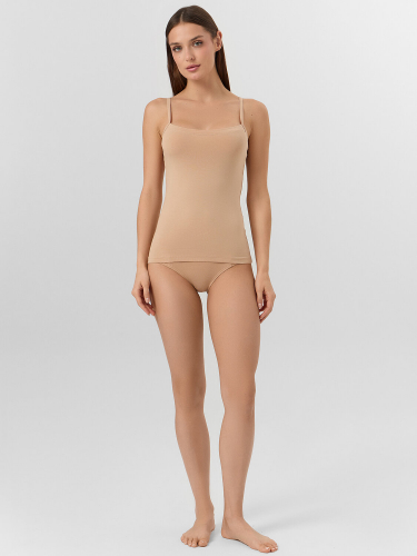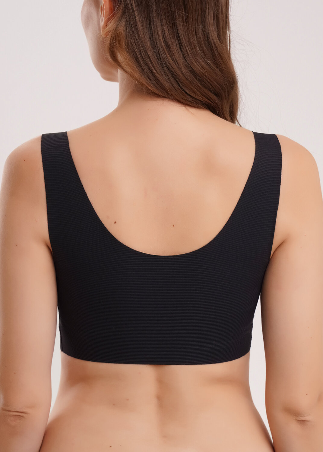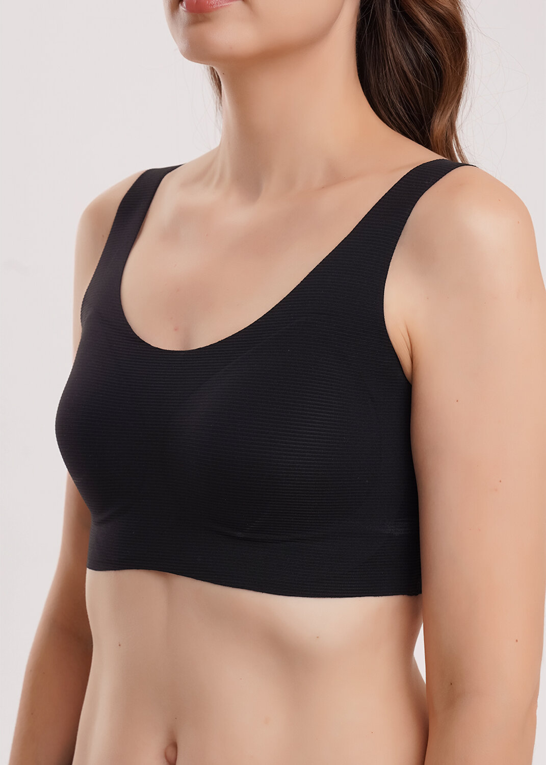 Бюстгальтер спортивный без каркасов выполнен из микрофибры. Тонкие формованные чашки. Бретели регулируемые. Впереди вставки из сетки.