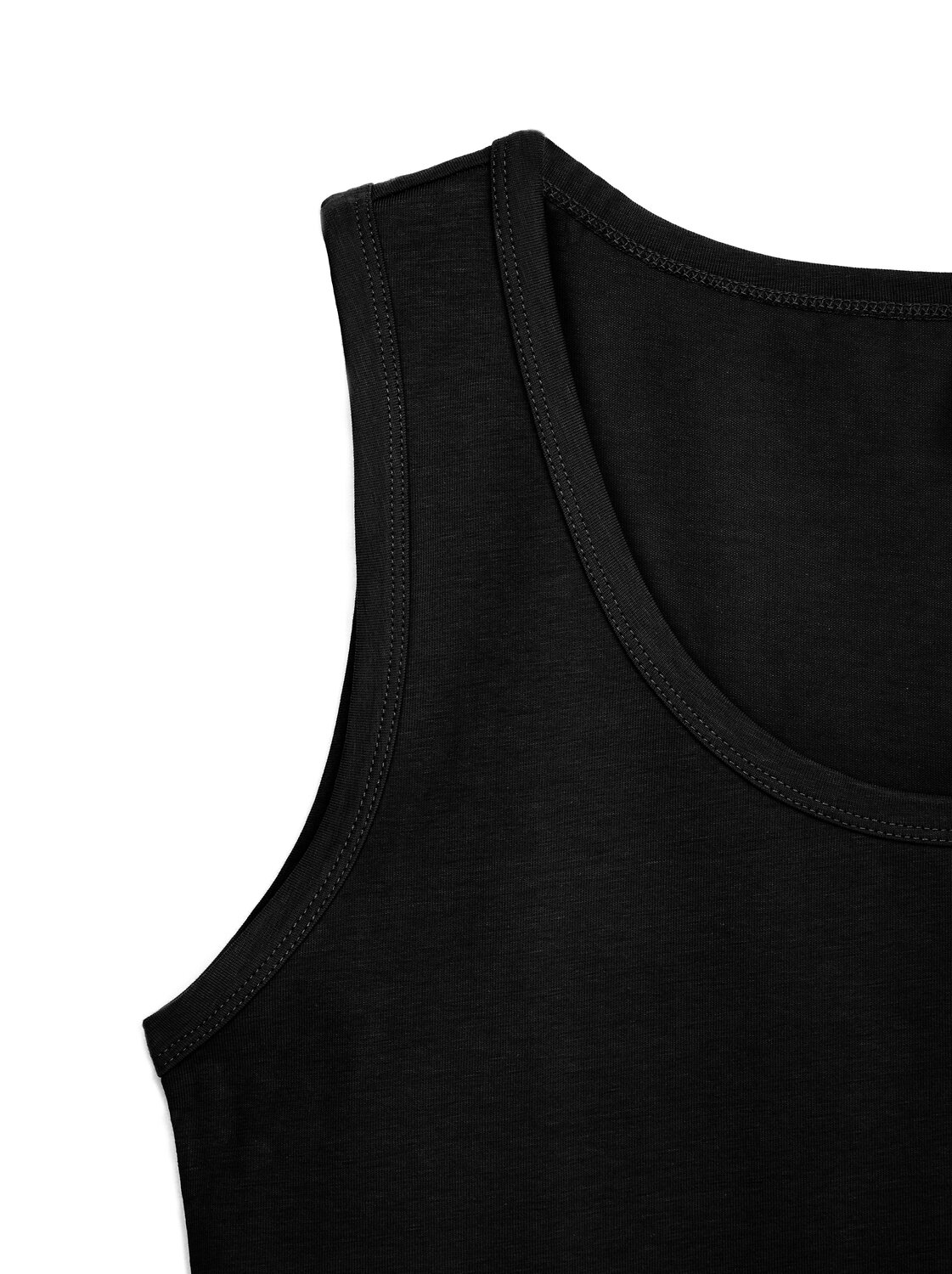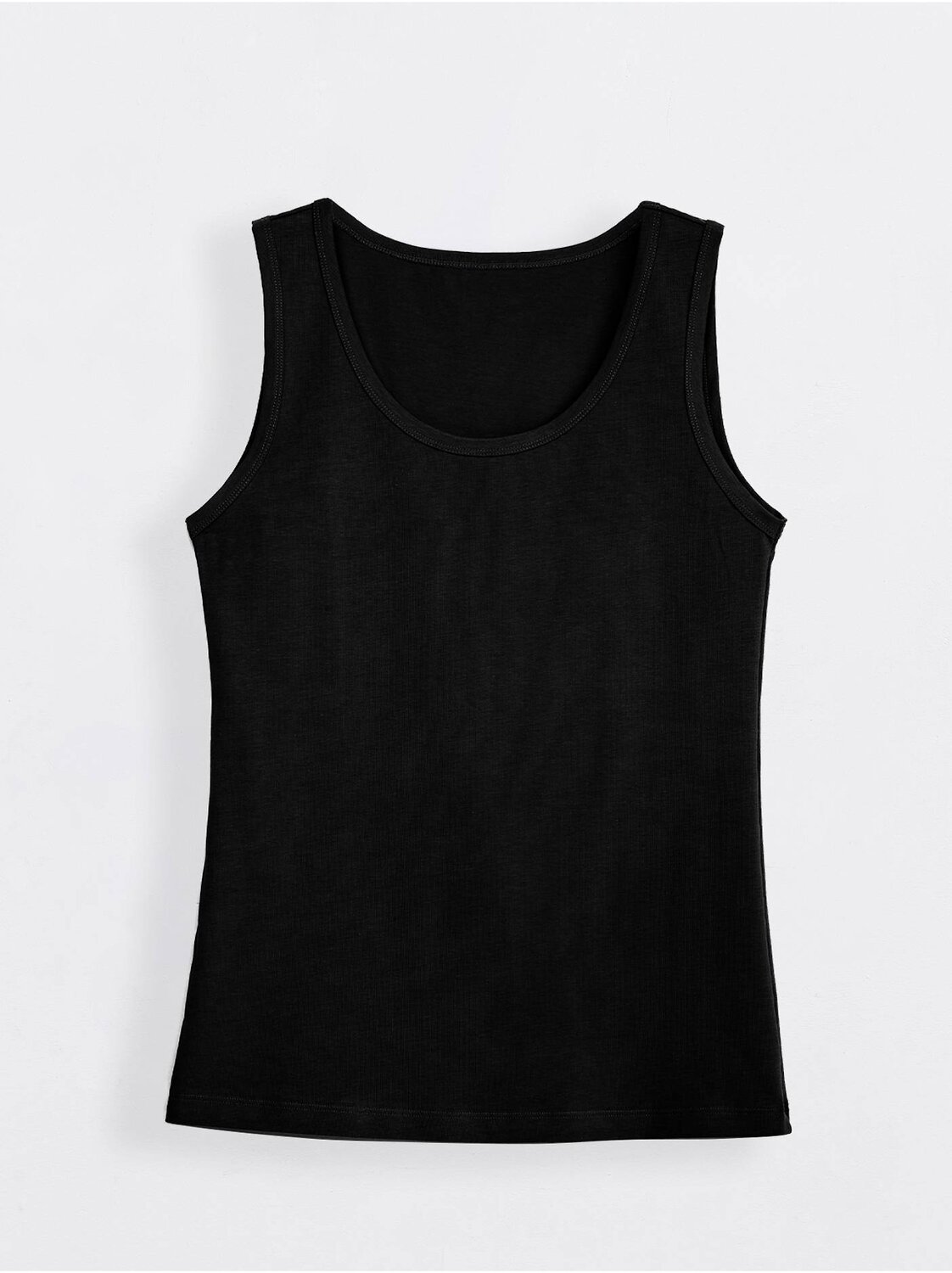 Майка женская бельевая из однотонного трикотажного полотна с глубоким вырезом горловины по переду. Горловина и пройма окантованы бейкой.