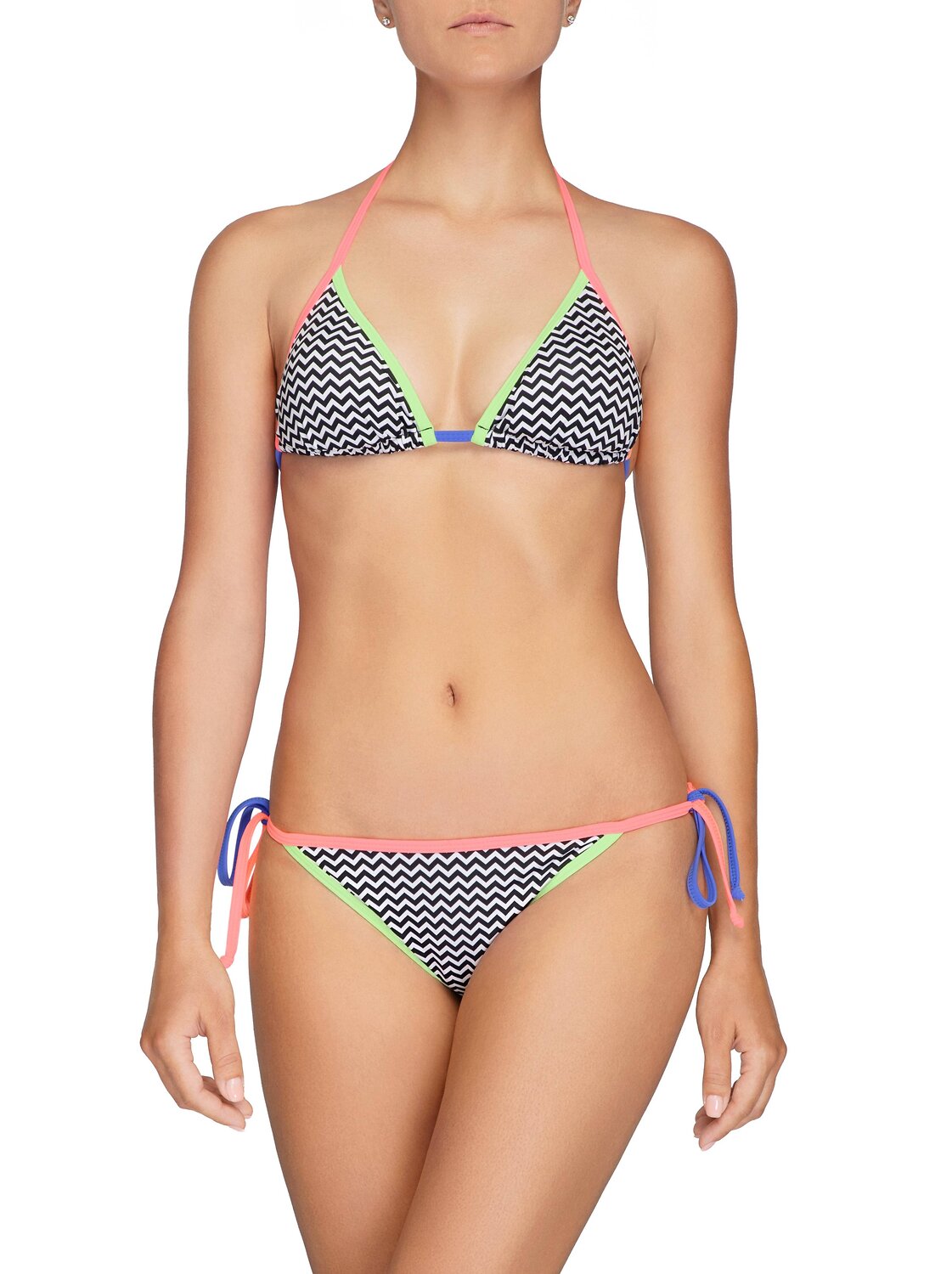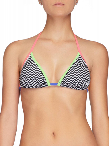 Миниатюрный мягкий лиф с принтом зигзаг и яркой окантовкой. В комплект входят вкладыши "PUSH- UP", которые подчеркивают грудь и придают ей дополнительный объем. Лиф регулируется по фигуре при помощи завязок на шее и спине.