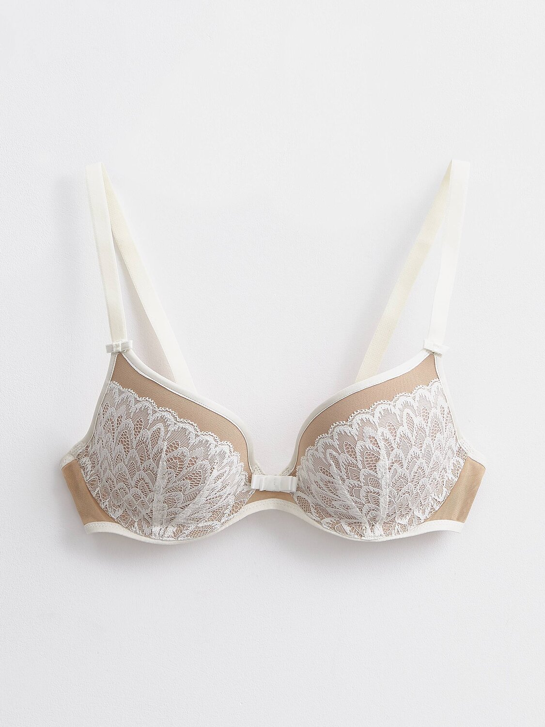 Бюстгальтер серии Venus выполнен из изящного кружева с необычным рисунком. Легкость узора поддерживается воздушной сеткой с деликатным блеском.