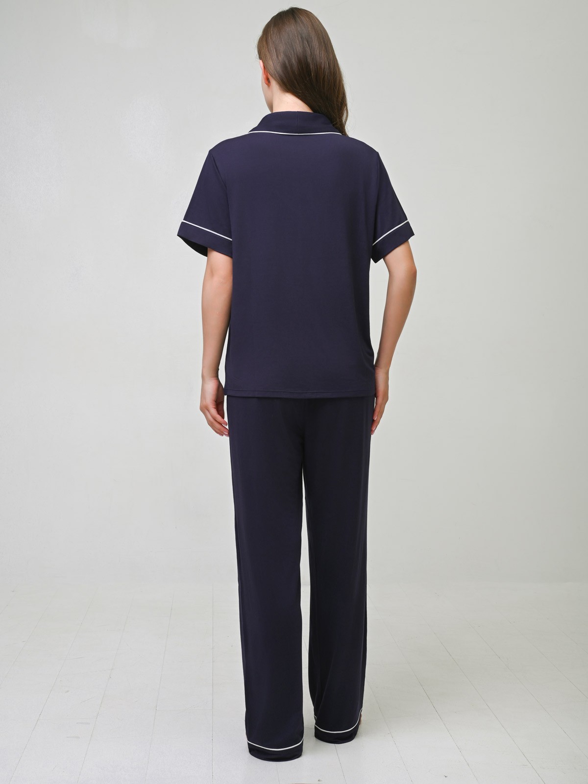 Пижама женская синяя 4263TBC бренда Indefini, изготовленная из модала, состоит из футболки и брюк.