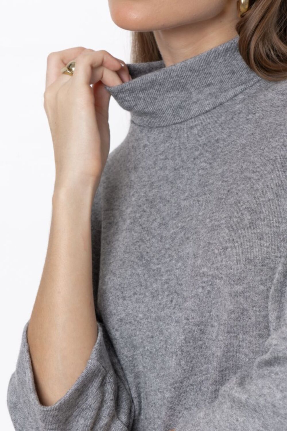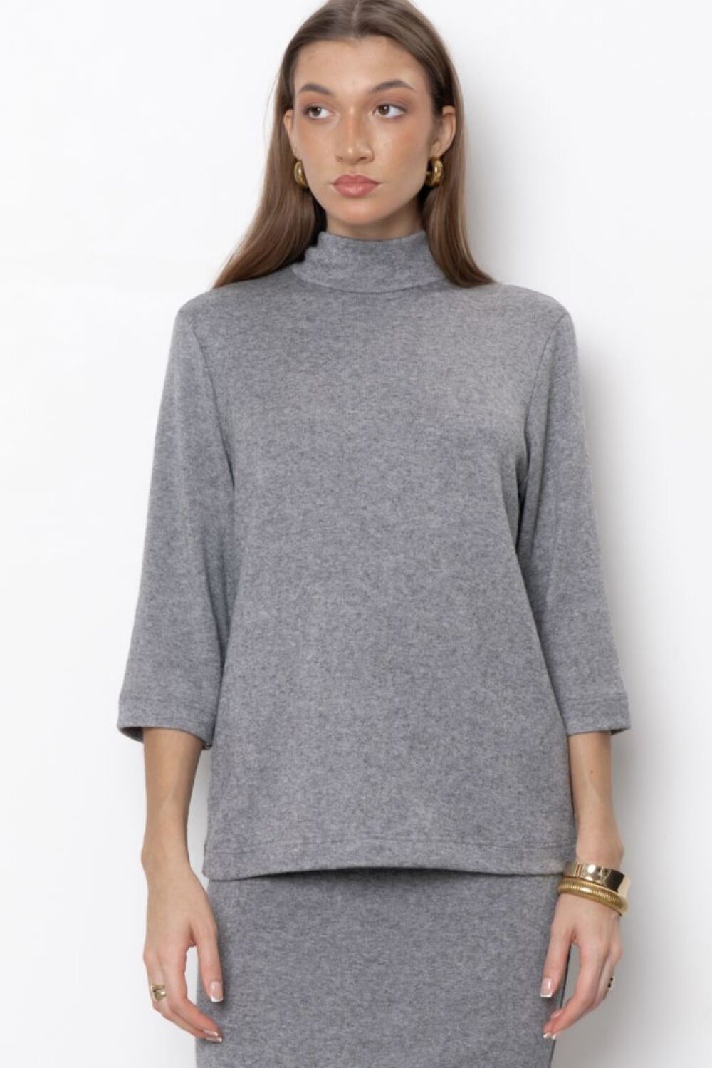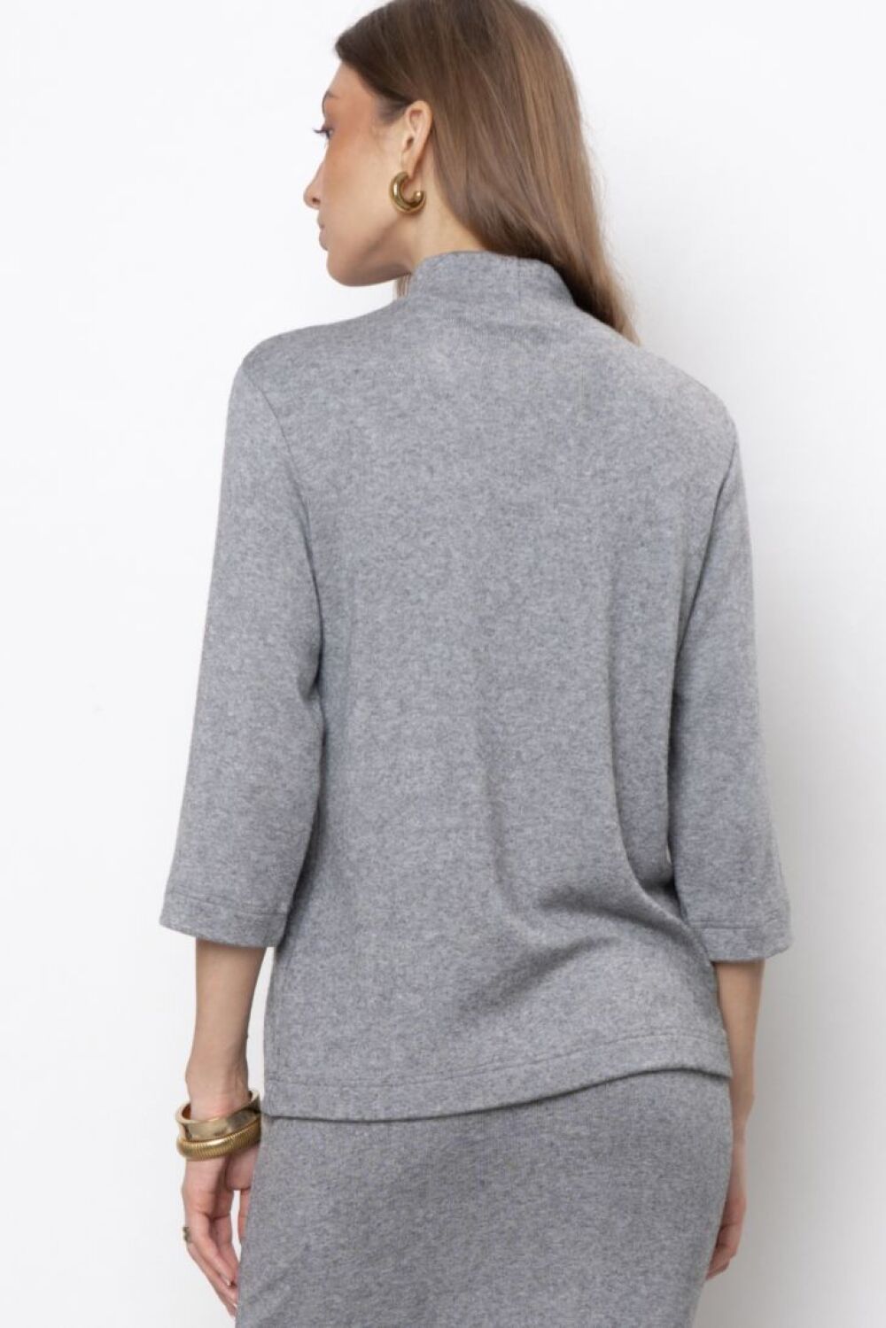 Джемпер свободного силуэта с высокой горловиной и рукавами ¾. Представлен в двух цветовых решениях."