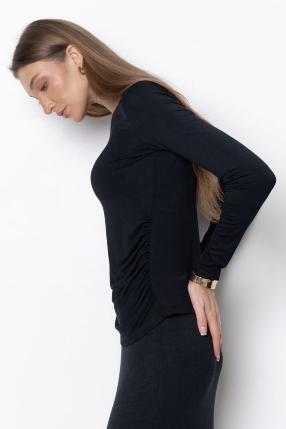 Джемпер прилегающего силуэта из натурального трикотажного полотна высокого качества, в составе которого бамбук. Легкая ассиметричная драпировка по низу изделия с одной стороны добавляет образу деликатный акцент. Джемпер идеально сочетается со всеми моделями коллекции «Джерси». Представлен в двух цветовых решениях."