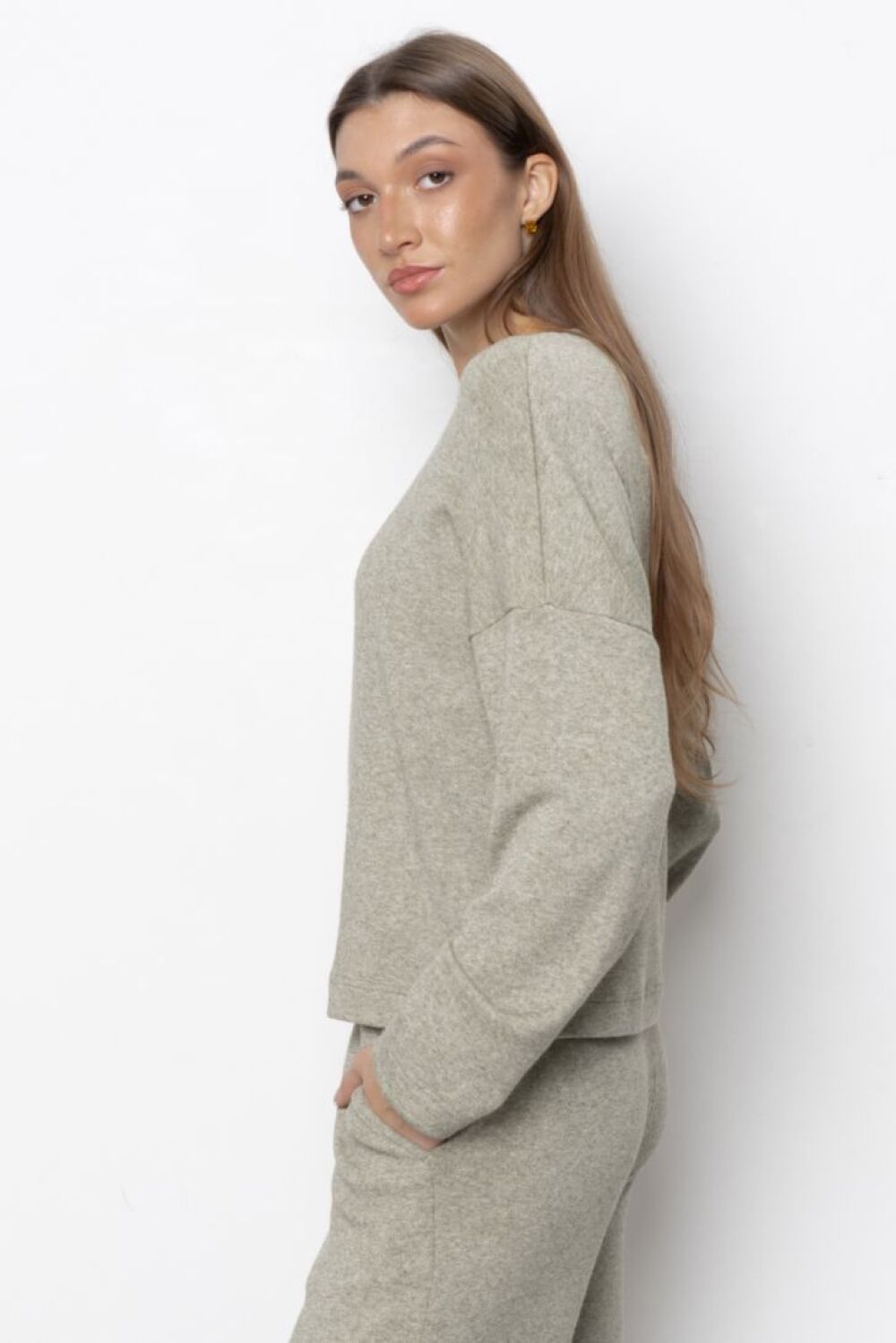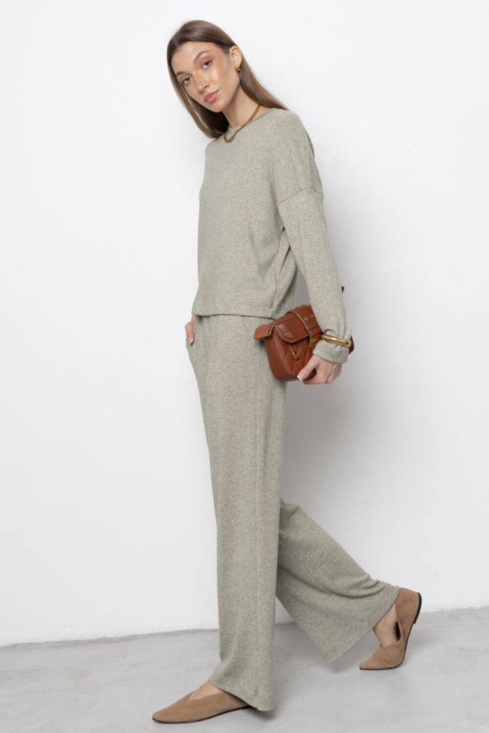 Джемпер свободного силуэта с круглой горловиной, спущенной линией плеча и длинными рукавами. Модель представлена в двух цветовых решениях. "