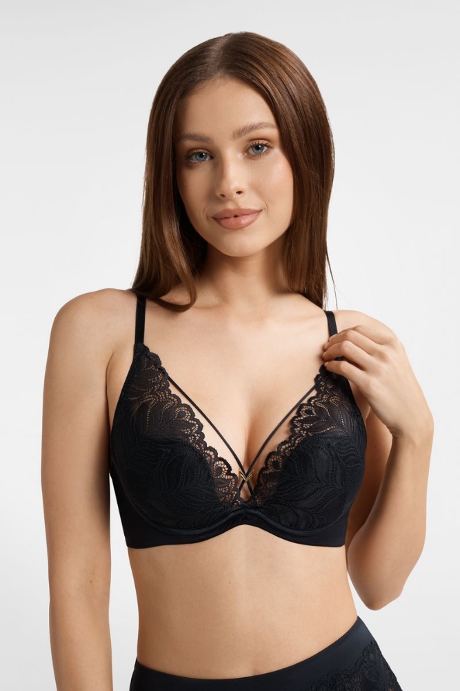 Черный 70F Кружевной бюстгальтер со съемным пуш-ап на кости. Чашка на базе Claudia. С глубоким декольте. Несъемные регулируемые бретели. Внутренняя поверхность чашек хлопковая. Кружево 90% полиамид, 10% эластанОсновная ткань 78% полиамид, 22% эластанСетка 84% полиамид, 16% эластан Подклад чашки 100% хлопок 90% полиамид, 10% эластан