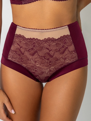 Бургундия 44, 46, 48 Трусы-слип комфорт с завышенной линией талии. Выполнены из эластичного шелковистого полотна с сатиновым блеском и эластичного кружева 65% Полиамид, 25% Эластан, 10% Хлопок