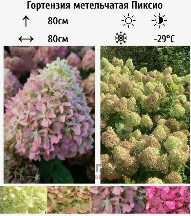 Hydrangea Pixio хорошо растет и окрашивается в садах и контейнерах. Цветочные метелки меняют цвет с бело-лаймово-зеленого на зеленый и розовый. Pixio имеет компактный рост и вырастает примерно до 80 см в высоту и ширину. Этот куст очень хорошо разветвлен, что делает растение густым и цветущим. Цветоносы крепкие, и Pixio дает больше цветочных метелок, чем многие обычные сорта метельчатых. Лепестки цветов очень красивые. Поместите Pixio на солнце в полутень в плодородную, влажную, но хорошо дренированную почву. Пиксио прекрасно дополняет бордюр из кустарников, но также отлично подходит для групповой посадки или для выращивания в контейнере на террасе или балконе.