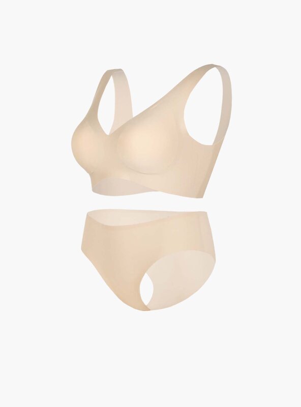 Комплект нижнего белья от торговой марки Индефини. В комплекте бюстгальтер и трусики. Бюстгальтер из полиамида, бежевого цвета, бесшовный, со съемными чашками, без Push-up, без косточек, с тонкой подкладкой, на застежке, на широких лямках. Трусы-слипы из полиамида, бежевого цвета, бесшовные, с высокой посадкой.