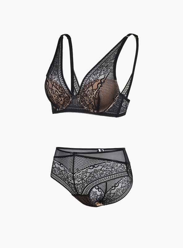 Комплект нижнего белья от торговой марки Индефини. В комплекте бюстгальтер и трусики. Бюстгальтер из полиамида, черного цвета, из кружевной ткани, на косточках, с косточками по бокам, с небольшим Push-up, с обрамлением, на тонких лямках, лямки регулируются. Трусы-слипы из полиамида, черного цвета, из кружевной ткани, с обрамлением, на мягкой резинке, с высокой посадкой.