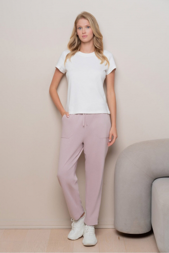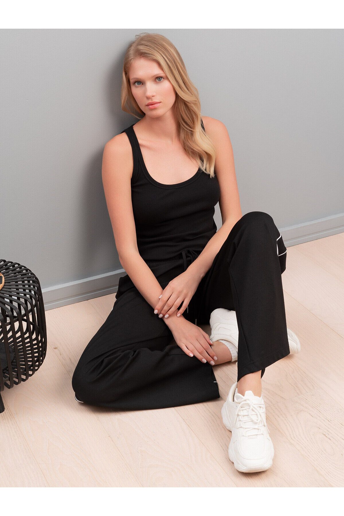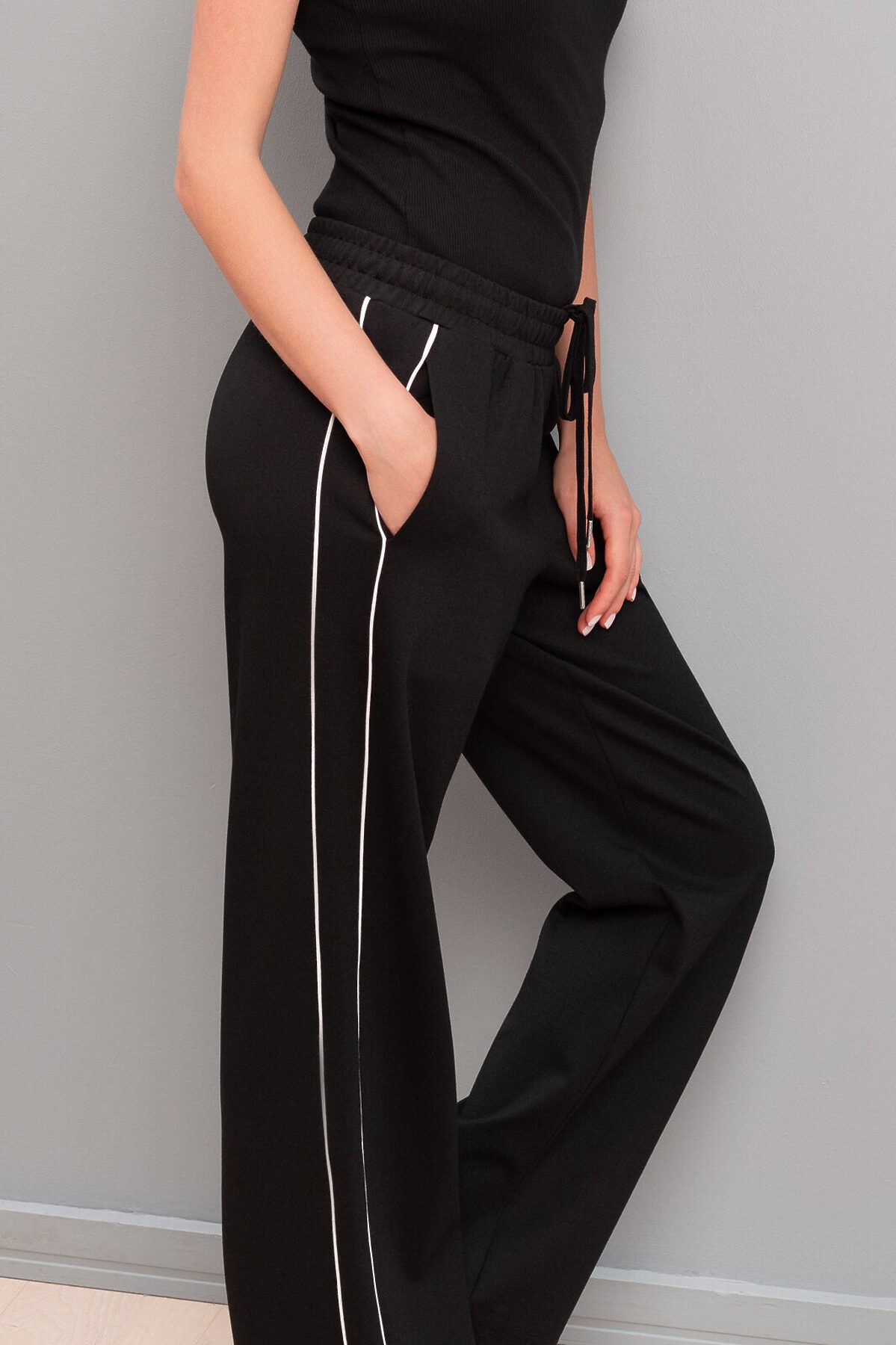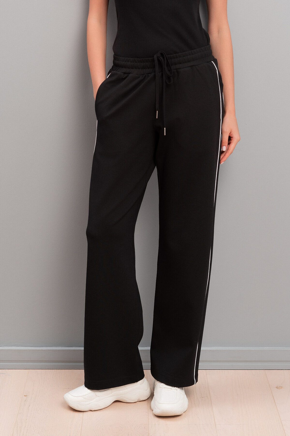 Женские домашние брюки, изготовленные из смесовой ткани, выполнены в классическом черном цвете с белыми полосками по бокам. Брюки прямого свободного кроя с боковыми карманами имеют широкую эластичную резинку на талии с регулирующим шнурком.