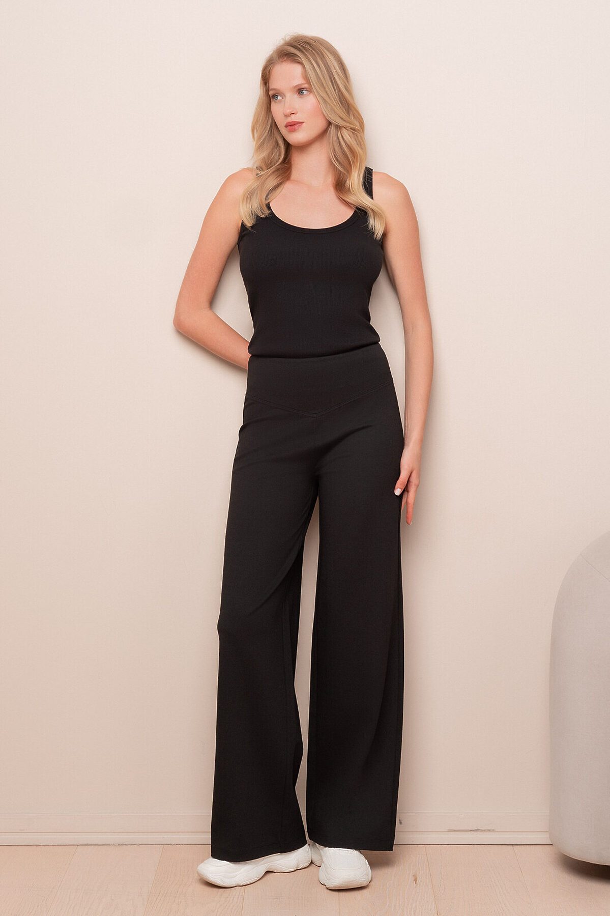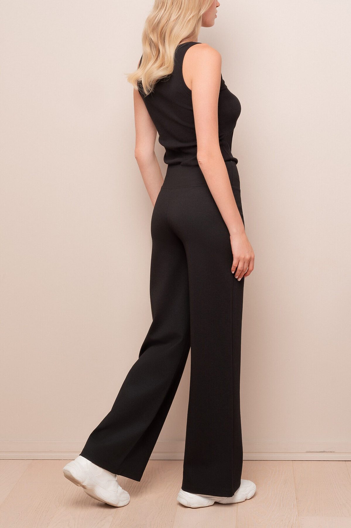 Элегантные черные брюки расклешенного кроя, создающие эффектный силуэт. Сшиты из мягкой смесовой ткани с преобладанием вискозы для комфорта и полиамида для сохранения формы.