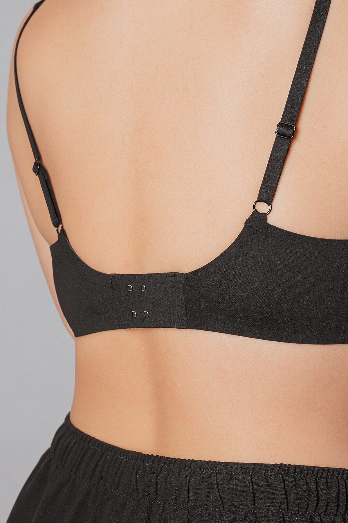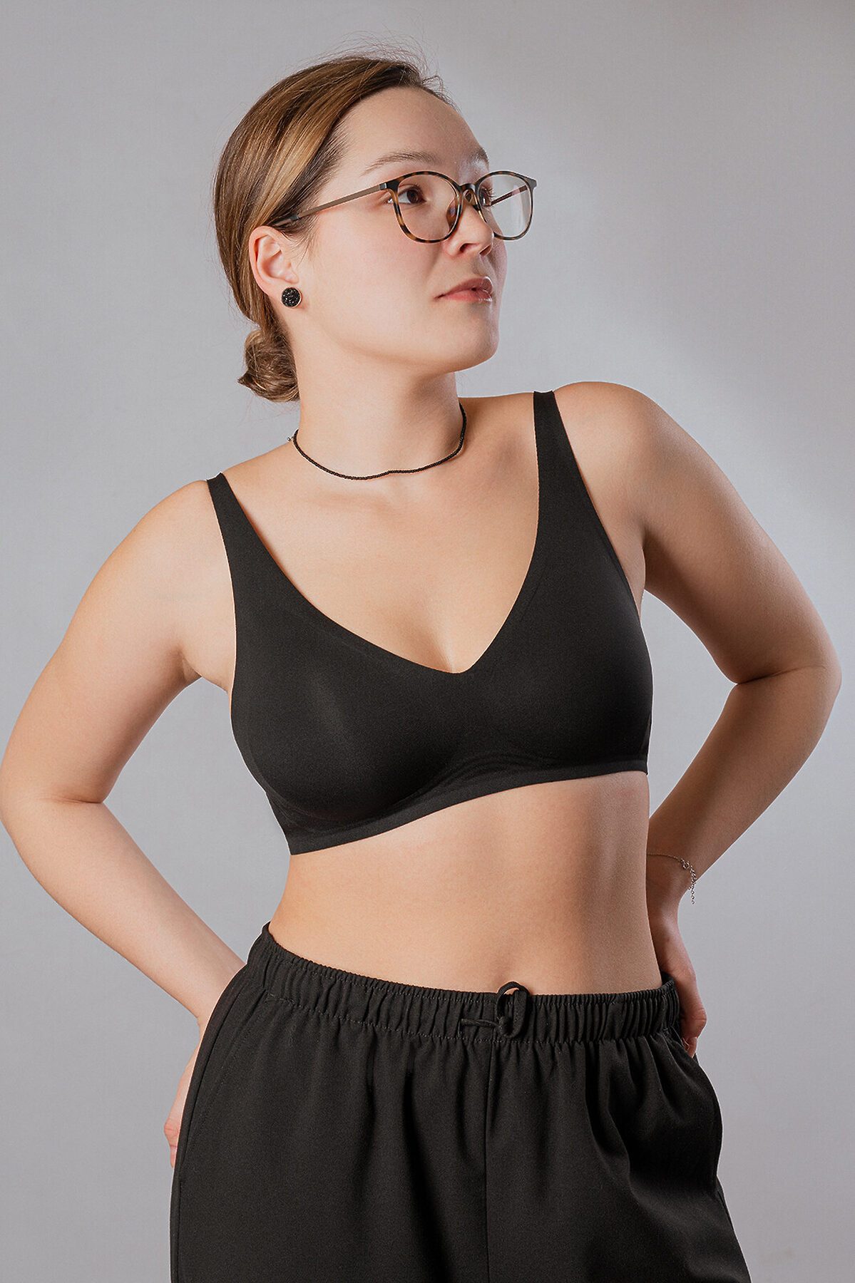 Базовый бюстгальтер без косточек изготовлен из полиамида и выполнен в классическом черном цвете. Поролоновые чашки имеют небольшой Push-up, тонкие бретели регулируются. Сзади бюстгальтер застёгивается на крючки.