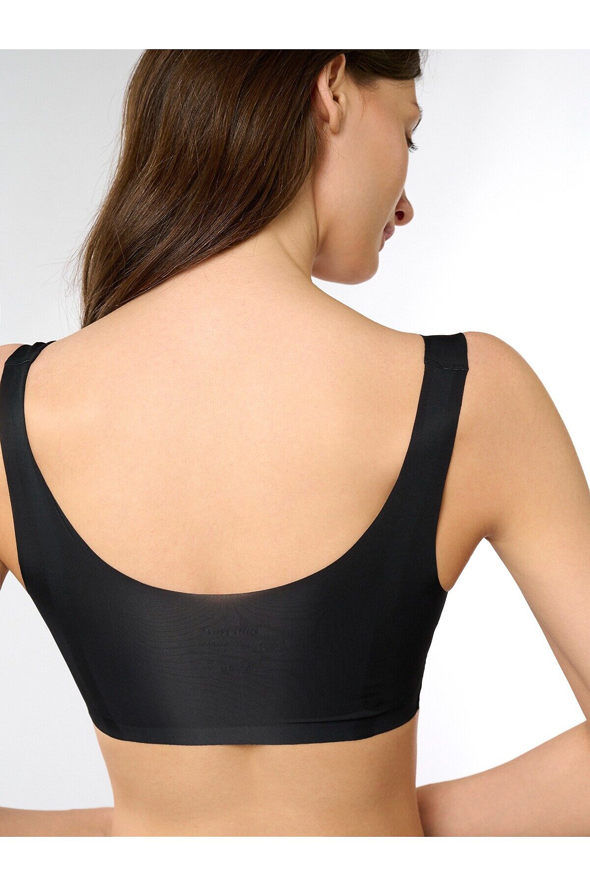 Чёрный бюстгальтер-топ без косточек. Современный чёрный бюстгальтер выполнен из мягкого эластичного материала, обеспечивающего комфортную посадку и свободу движений. Модель не имеет каркасных косточек и застёжек, что делает её максимально удобной для повседневной носки. Особенности: ✔ Широкие эластичные бретели – не натирают и не сползают, равномерно распределяют нагрузку ✔ Бесшовная технология – незаметен под одеждой, не оставляет следов на коже ✔ Мягкая, эластичная чашка – поддерживает грудь и сохраняет естественный силуэт (несъёмная) ✔ Лёгкая и дышащая ткань – комфортна даже в течение всего дня Идеальный выбор для тех, кто ценит комфорт, минимализм и современный стиль.