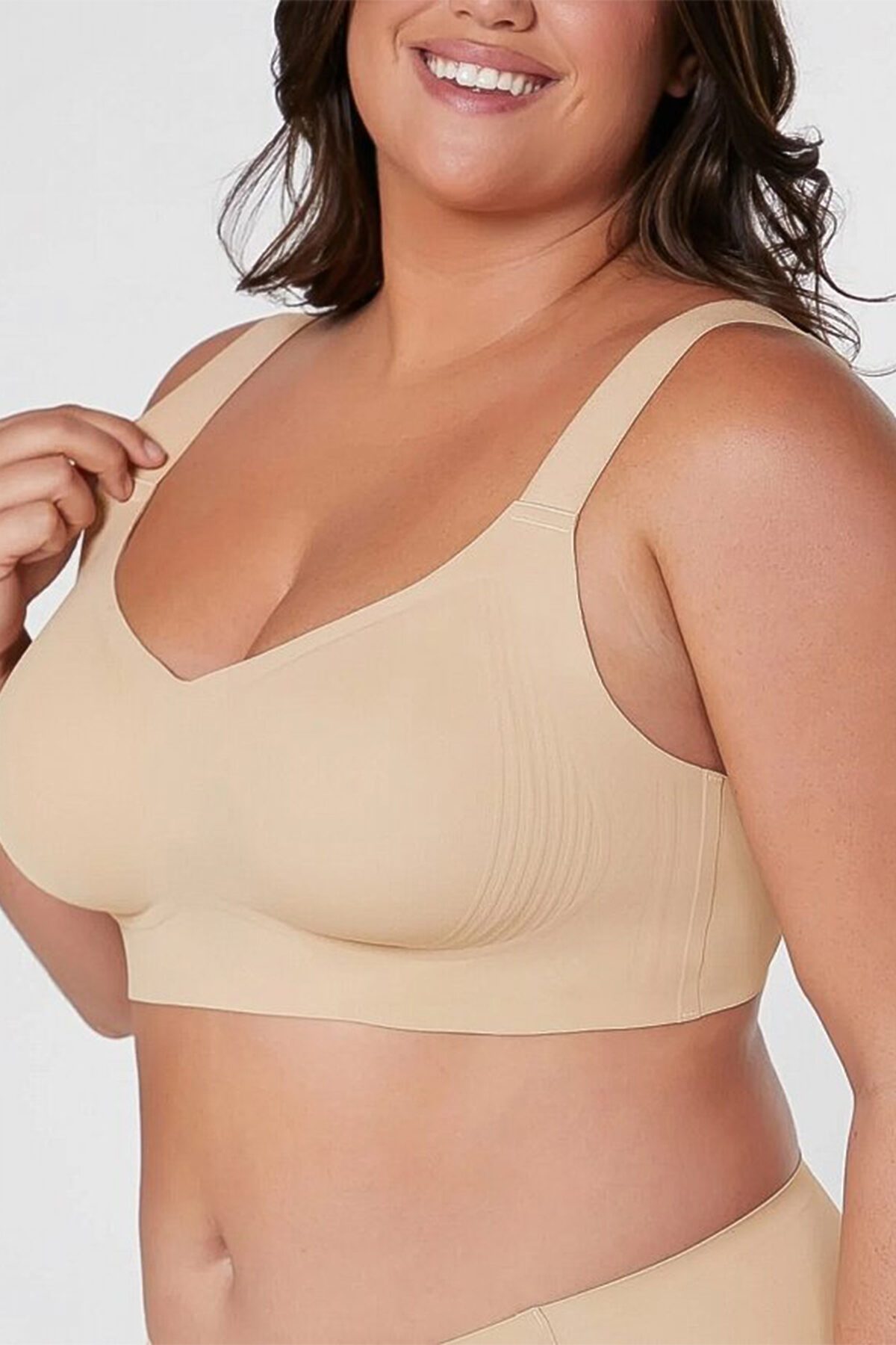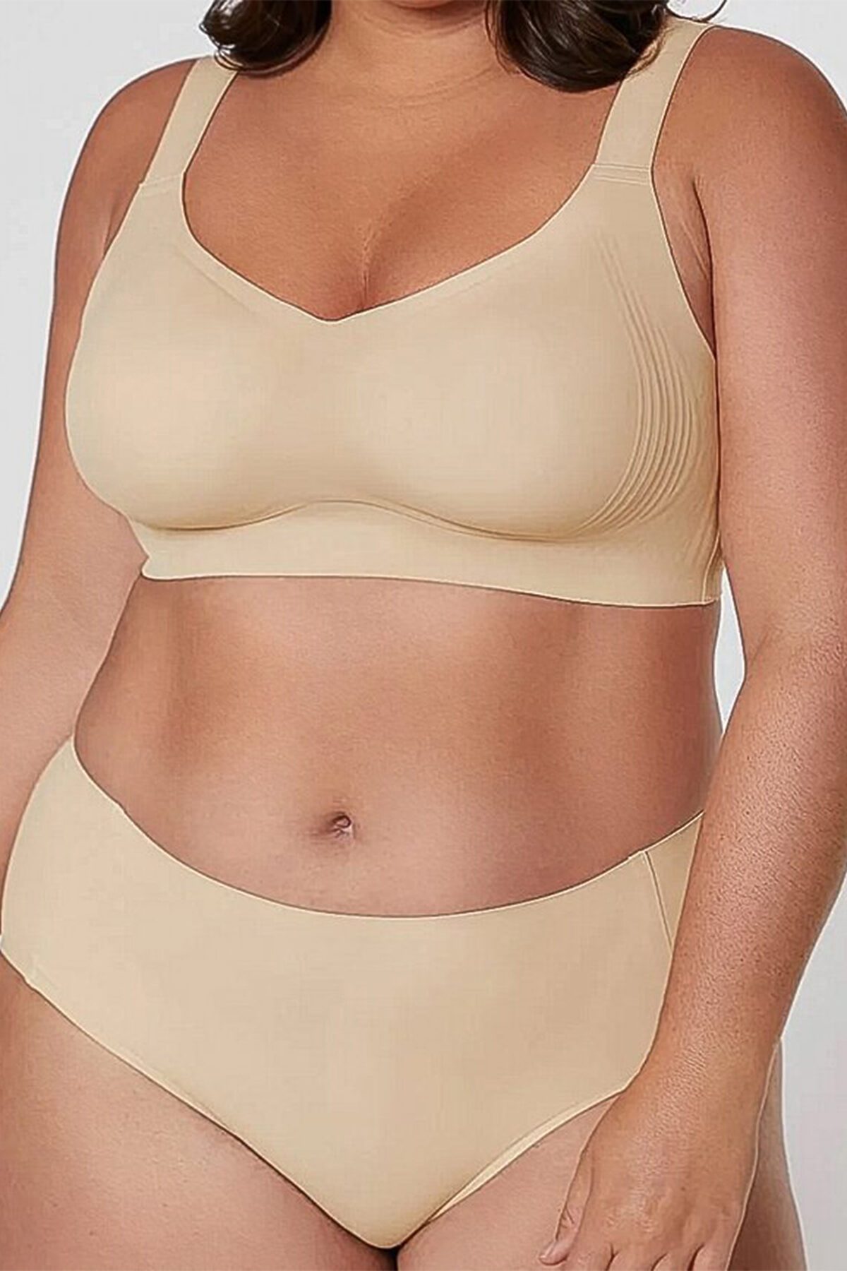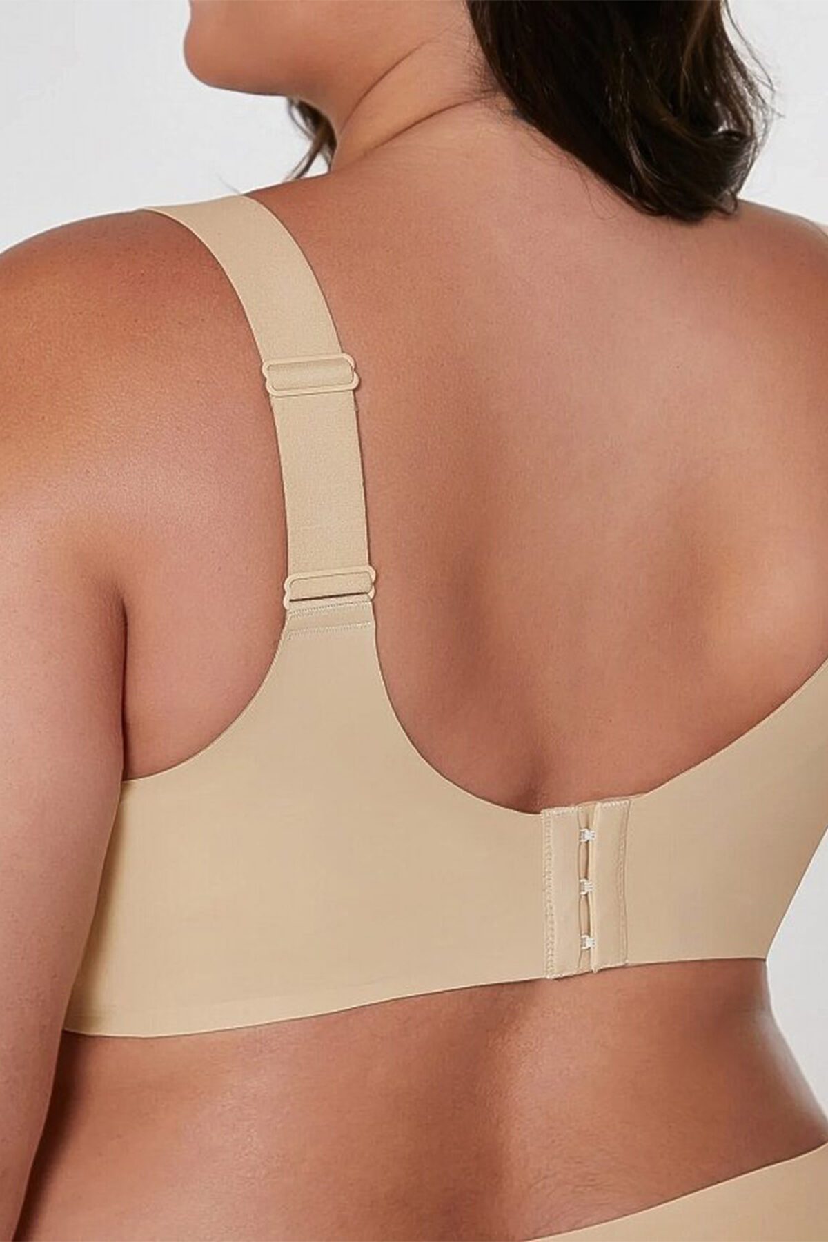 Бесшовный бюстгальтер-топ от торговой марки Индефини. Бюстгальтер-топ из полиамида, бежевого цвета, без косточек, без Push-up, с несъемным вкладышем, на широких бретелях, бесшовный, на застежках-крючках, бретели регулируются.