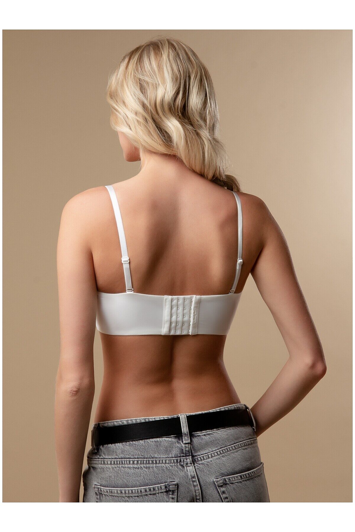 Бюстгальтер от торговой марки Индефини. Бюстгальтер из полиамида, белого цвета, на косточках, с формованными чашками, с Push-up, на широком поясе, с косточками сбоку, на застежках, на тонких лямках, лямки отстегиваются, лямки регулируются.
