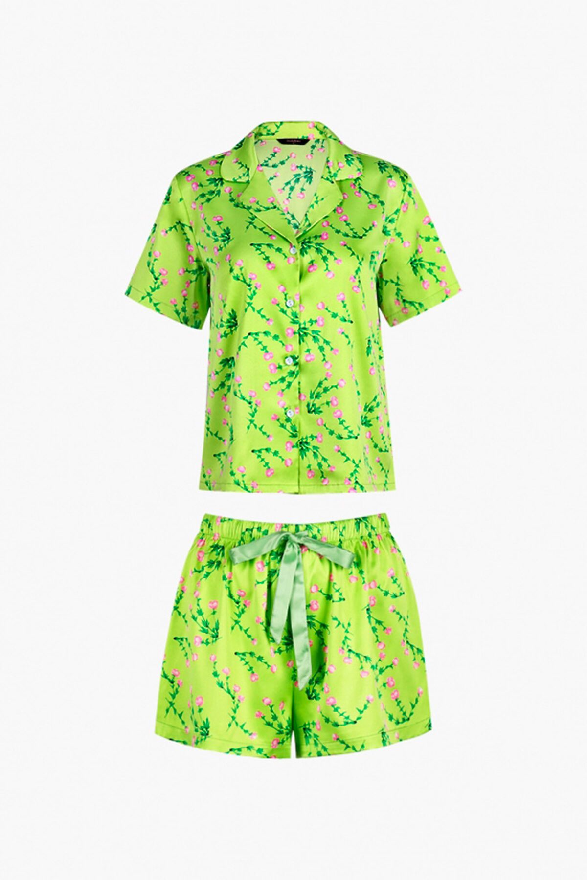 Домашняя пижама от торговой марки Индефини. В комплект входит рубашка и шорты. Рубашка из полиэстера, зеленого цвета, с цветочным принтом, с короткими рукавами, с воротником-отворотом, на пуговичках, прямая, свободного кроя. Шорты из полиэстера, зеленого цвета, с цветочным принтом, с обрамлением, прямые, свободного кроя, на мягкой резинке, с регулирующей атласной лентой.