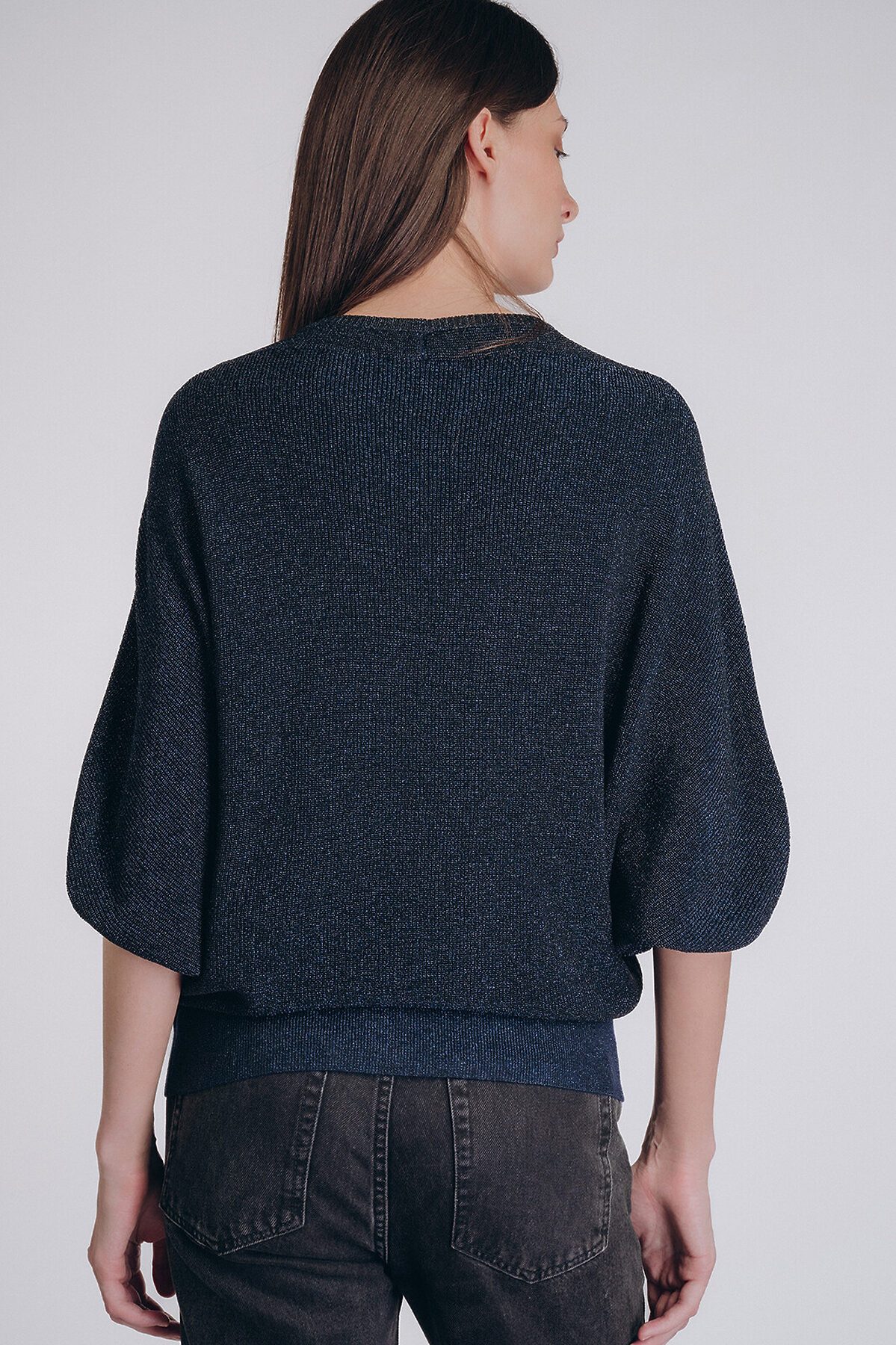 Женская кофта бренда Indefini выполнена в элегантном темно-синем цвете из мягкой смесовой ткани с добавлением полиэстера, акрила, шерсти и металлизированной нити. Лёгкая дышащая ткань и оригинальный свободный крой с прорезями для рук обеспечивают комфорт и свободу движений. Глубокий синий оттенок и деликатный блеск придают образу утончённость и современную лаконичность, делая эту кофту стильным акцентом вашего гардероба.