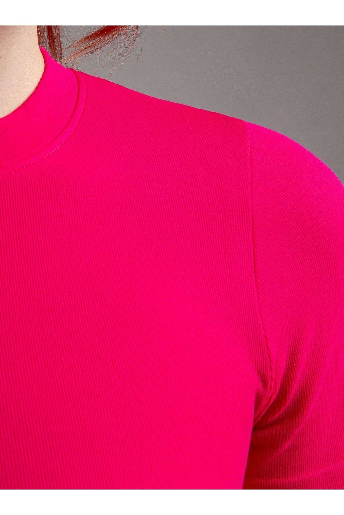Футболка из полиамида, цвета фуксии, с короткими рукавами, с небольшим горлом, в рубчик, облегающая, укороченная.