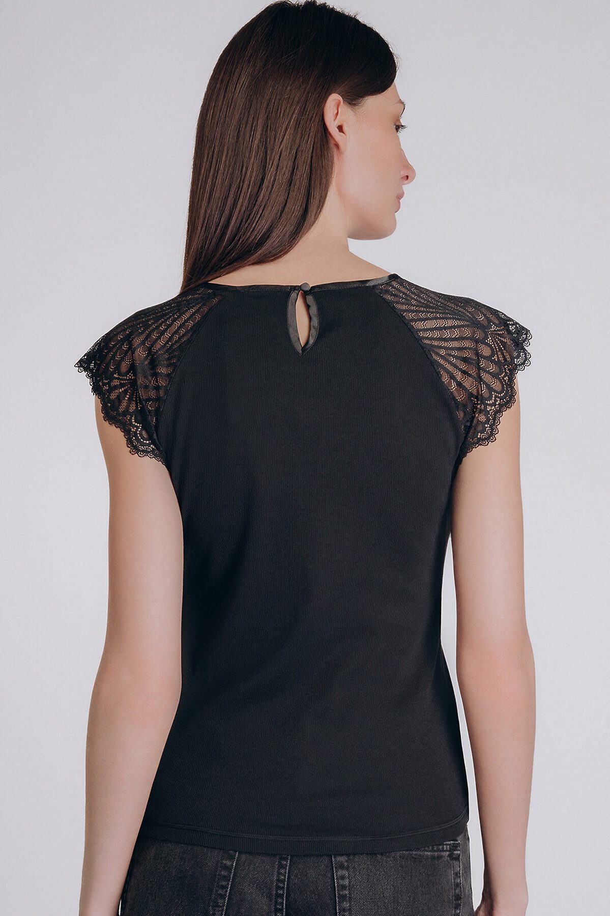 Женская майка чёрного цвета с кружевными вставками — это сочетание элегантности, женственности и повседневного комфорта. Параметры модели на фото: 89-61-95. Рост модели на фото: 179 см