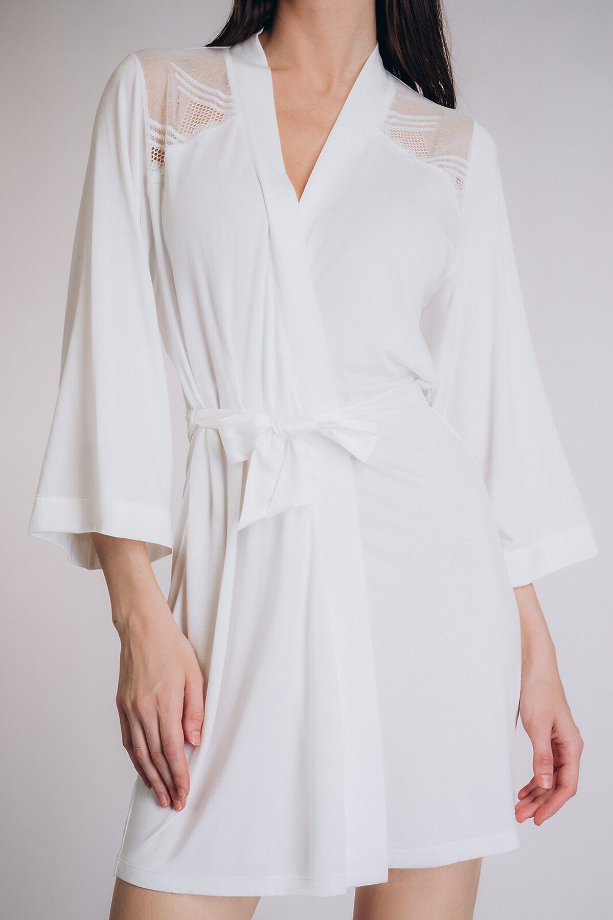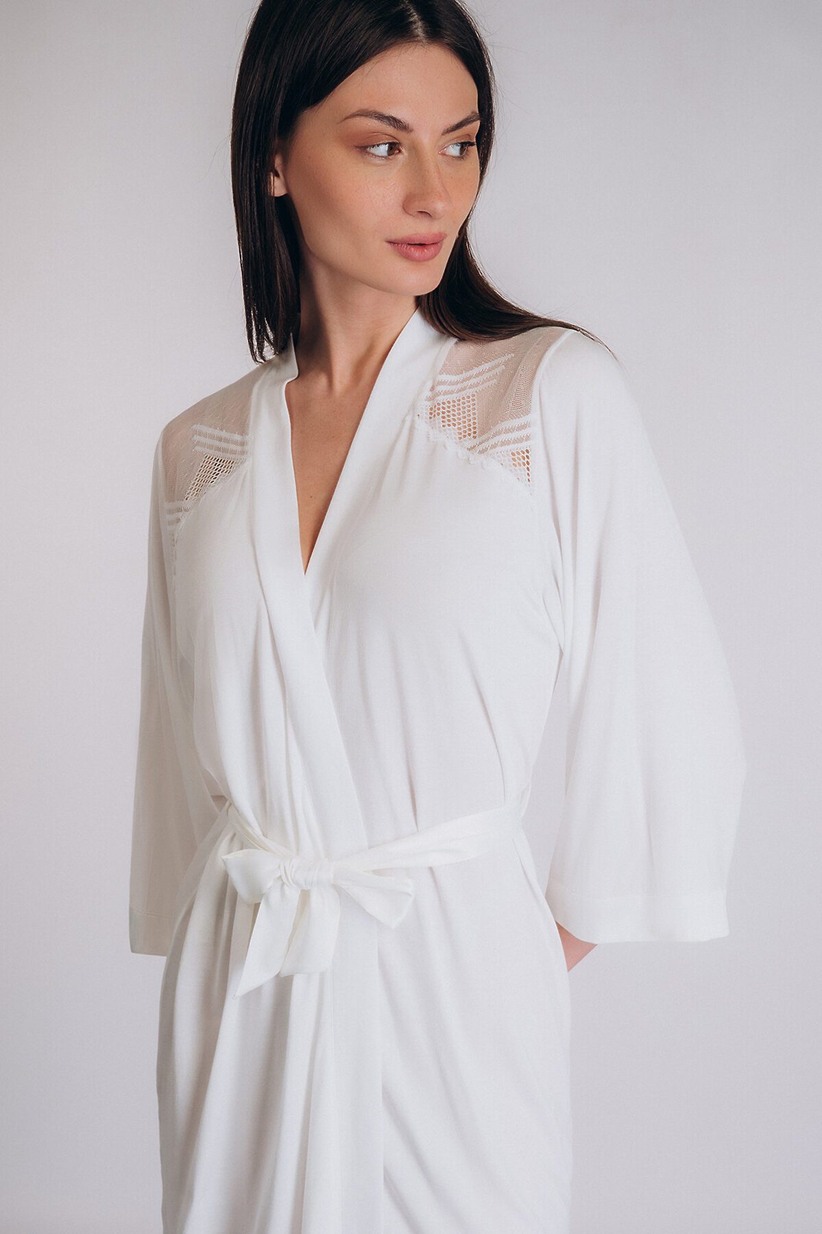 Женский халат Indefini белого цвета с кружевными вставками. Выполнен из легкой струящейся ткани, которая мягко обволакивает фигуру, создавая ощущение комфорта и роскоши. Ажурные кружева в области плеч – прозрачные и женственные, добавляют образу романтичности и легкости. Свободный силуэт – обеспечивает удобство и непринужденность в движении. Мягкая ткань – приятная к телу, идеальна для отдыха дома или романтических моментов. Халат прекрасно подойдет для утренних ритуалов или вечернего релакса, даря ощущение уюта и элегантности. Визуально сочетается с сорочкой арт.5019SDD Indefini, создавая гармоничный комплект в едином стиле – нежный, женственный и изысканный.
