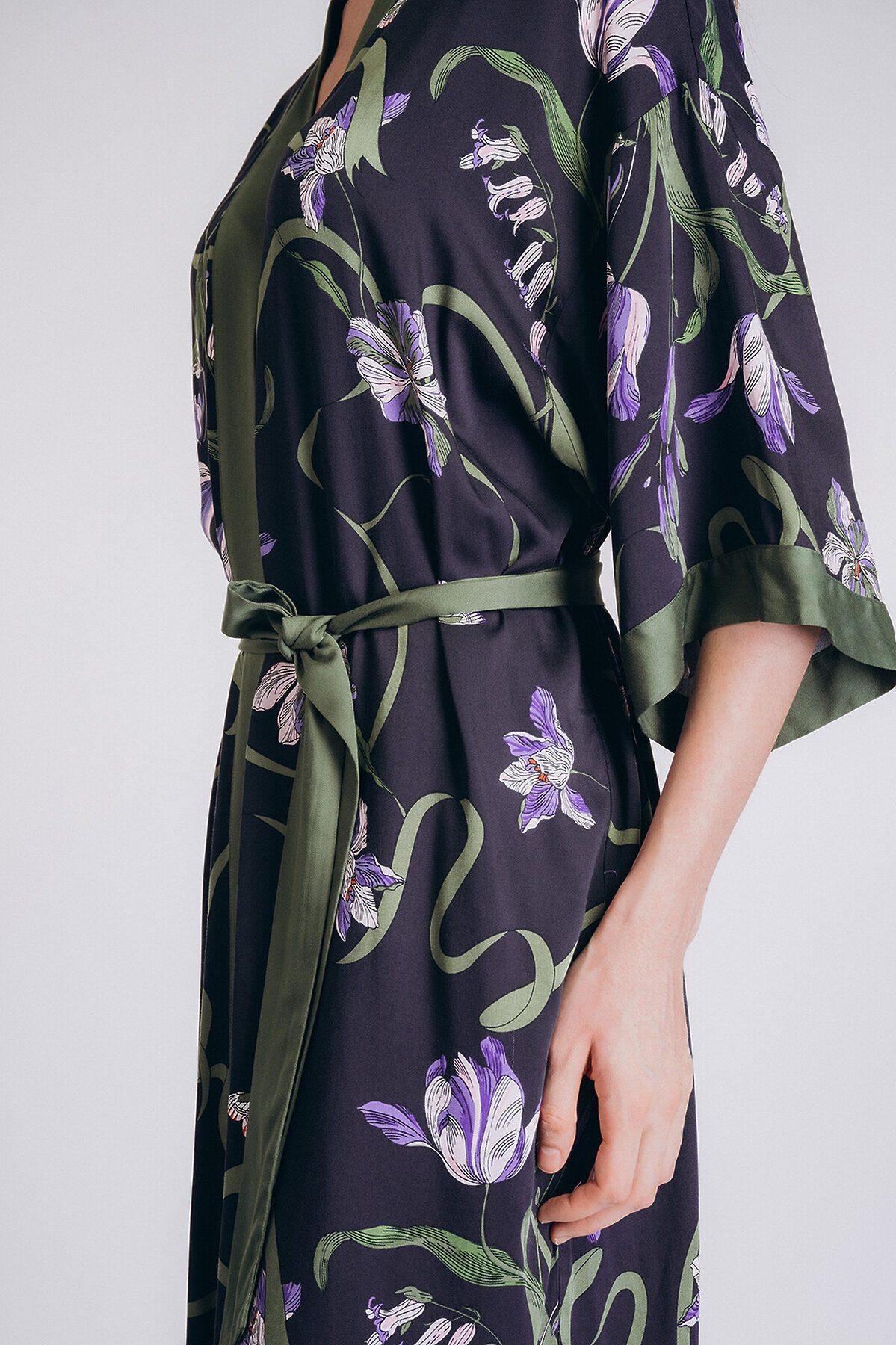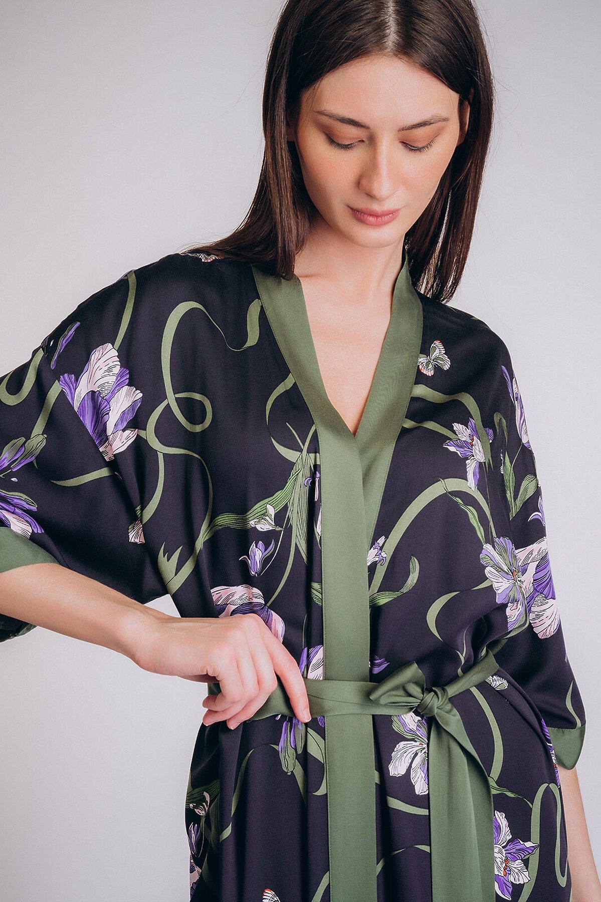 Женский халат 5024SYZ изготовлен из 100% вискозы. Ткань легкая и приятная на ощупь. Модель выполнена в черном цвете с контрастной отделкой по краям и прямым кроем. Халат имеет широкий рукав и пояс на талии для удобной фиксации. Изделие украшено ярким цветочным принтом с изображением цветов и бабочек. Идеально подходит для домашнего использования и создает ощущение уюта и комфорта. Параметры модели на фото: 89-61-95. Рост модели на фото: 179 см