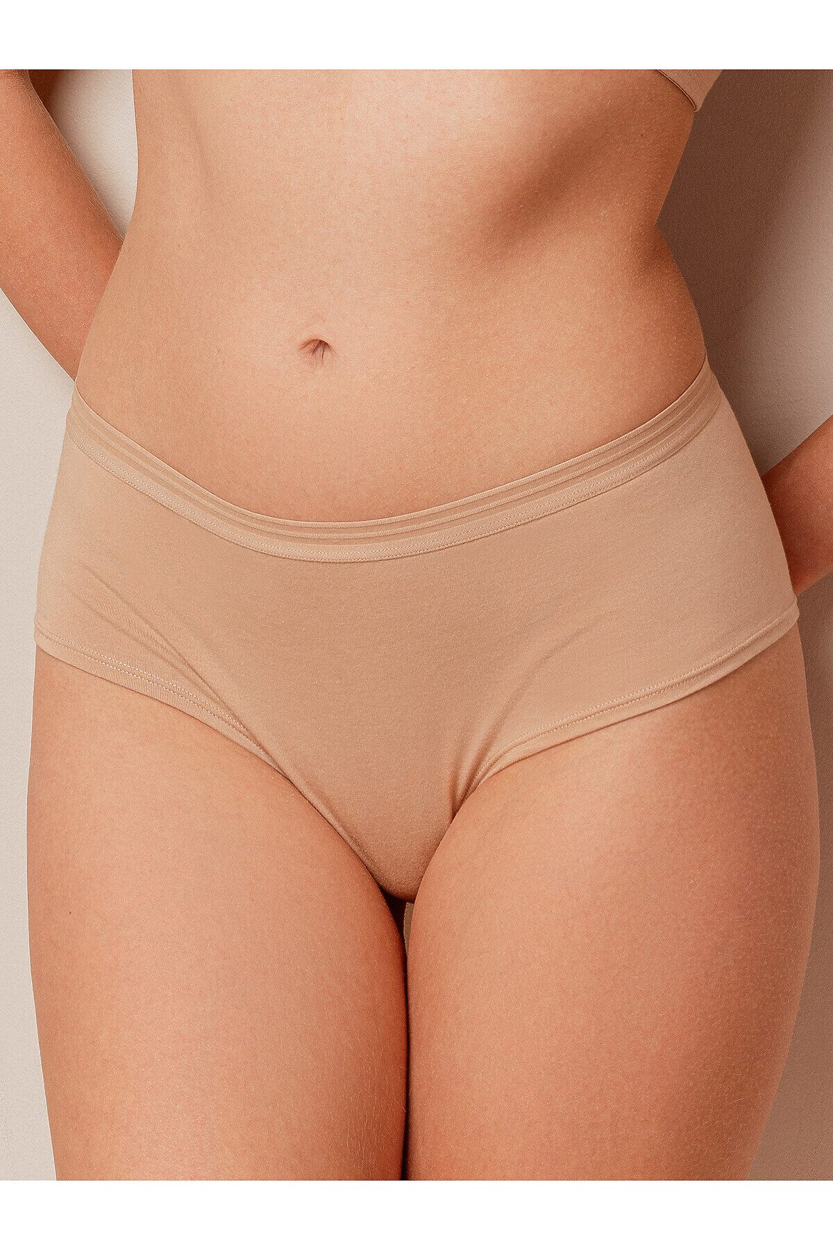 Комплект нижнего белья состоит из бюстгальтера и трусов слипов. В состав входит смесь бамбука и хлопка. Модель выполнена в классическом бежевом цвете. Базовый бюстгальтер с поролоновыми чашками на косточках без Push-Up. Тонкие регулируемые бретели отстёгиваются сзади, там же бюстгальтер застёгивается на крючки. Трусы слипы средней посадки имеют мягкую эластичную резинку на талии. К бюстгальтеру идут трусы-слипы размерами: 75B-S, 75C-M, 80B-M, 80C-L, 75D-L, 80D-XL, 85C-XL.