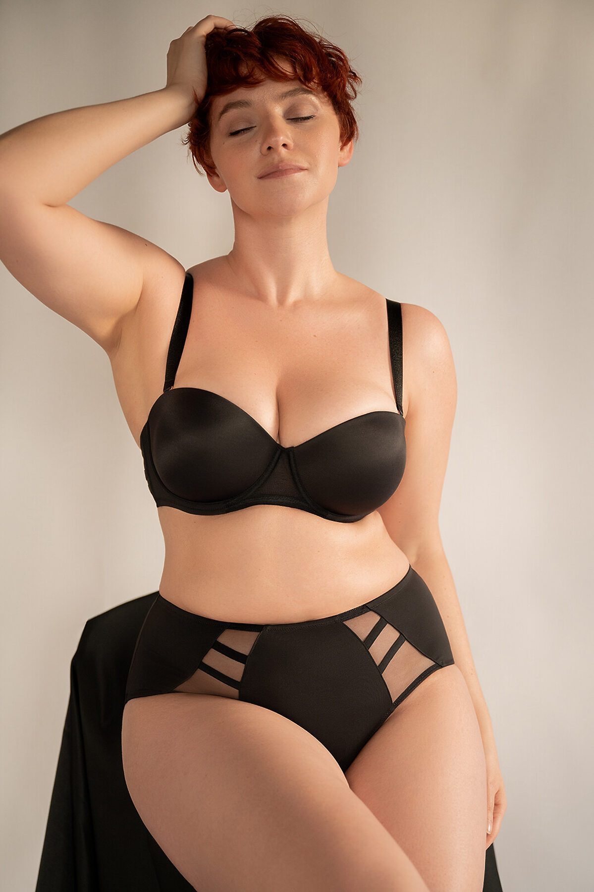 Комплект нижнего белья состоит из бюстгальтера и трусов-слипов. Бюстгальтер на тонких регулируемых бретелях имеет застёжки на крючках сзади. Поролоновые чашки на косточках выполнены без дополнительной поддержки груди. По бокам и между чашками спереди имеются сетчатые вставки. Трусы слипы высокой посадки имеют мягкую эластичную резинку на талии и сетчатые вставки спереди. На внутренней стороне трусов расположена хлопковая ластовица. К бюстгальтеру идут трусы слипы размерами: 80C-L, 80D-L, 85C-XL, 85D-XL, 90C-XL, 85E-XXL, 90D-XXL, 90E-XXL.