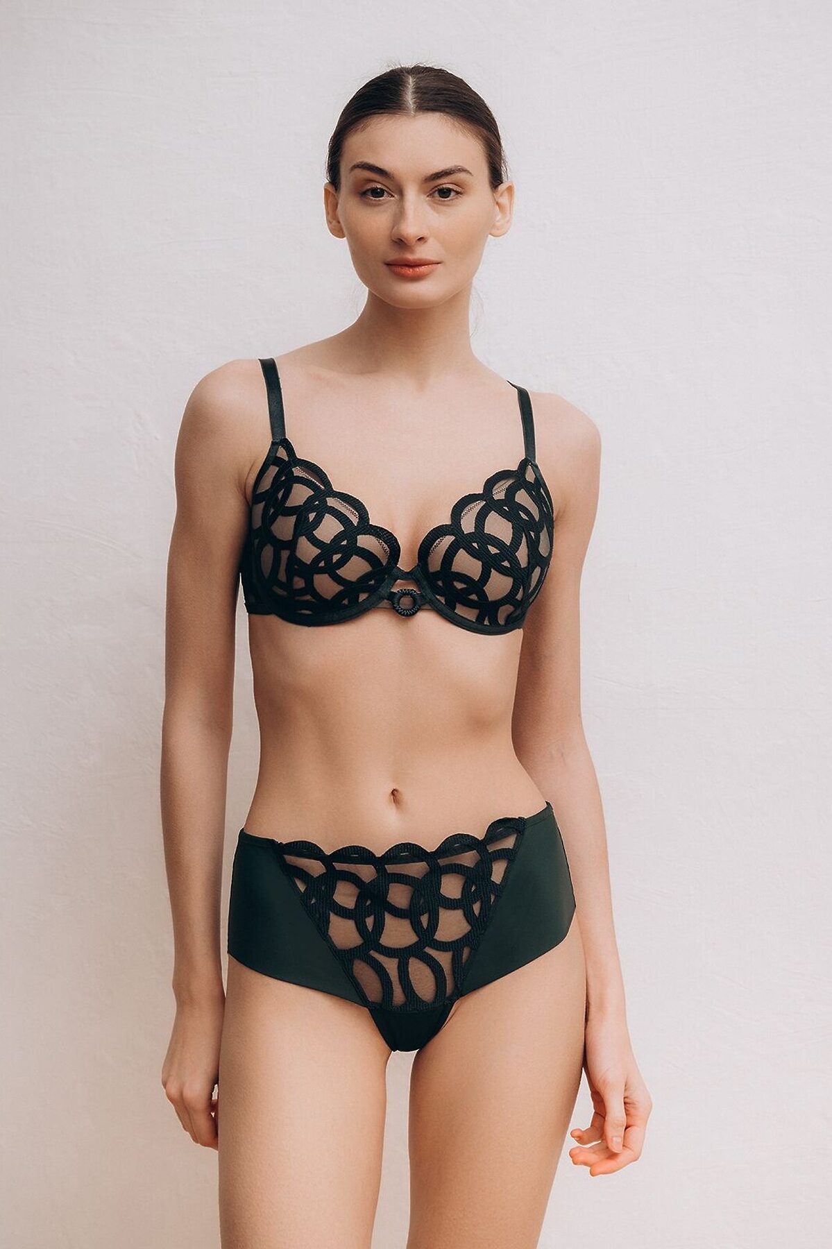 Комплект включает бюстгальтер и женские трусы слипы. Кружевной бюстгальтер на косточках, изготовленный из полиамида, надежно садится по фигуре, обеспечивая отличную поддержку благодаря поролоновым чашкам на косточках без Push-Up. Тонкие регулируемые бретели и застежка сзади позволяют настроить оптимальную посадку. Украшен бюстгальтер кружевом на чашках и декоративным элементом спереди. Трусы слипы женские, изготовленные из полиамида, обеспечивают оптимальную посадку с высокой талией и мягкой эластичной резинкой, не вызывающая дискомфорт. Спереди трусы украшены кружевом и сетчатыми вставками. К бюстгальтеру идут трусы слипы размерами: 75C-M, 80C-L, 75D-L, 80D-XL, 85C-XL, 85D-XL, 90C-L, 85E-XXL, 90D-XXL, 90E-XXL