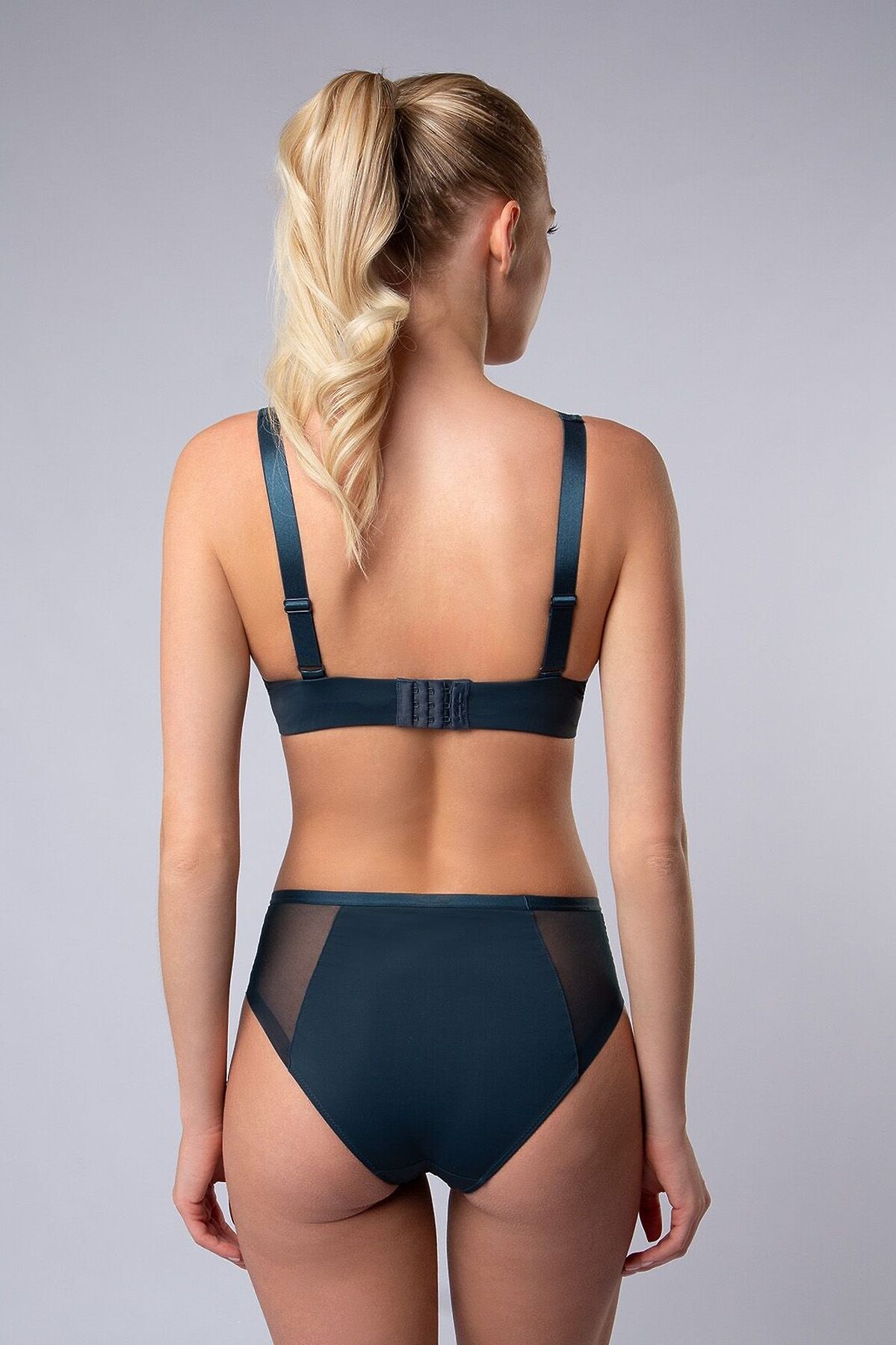Комплект нижнего белья от торговой марки Индефини. В комплекте бюстгальтер и трусики. Бюстгальтер из полиамида, изумрудного цвета, на косточках, с формованными чашками, с небольшим Push-up, со вставками из микросетки, с обрамлением, лямки регулируются. Трусы-слипы из полиамида, изумрудного цвета, со вставками из микросетки, с обрамлением, на мягкой резинке, средней посадки. К бюстгальтеру идут трусики, размером: 75B-S, 75C-M, 80B-M, 80C-L.