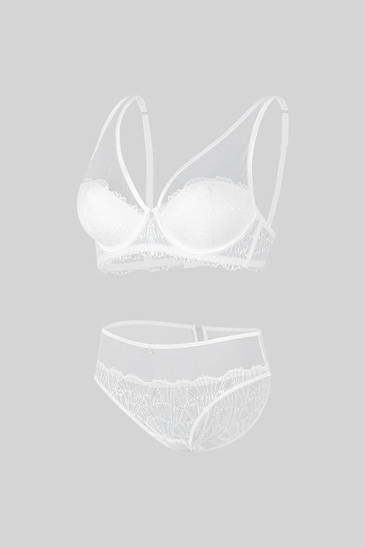 Комплект нижнего белья от торговой марки Индефини. В комплекте бюстгальтер и трусики. Бюстгальтер из полиамида, белого цвета, с кружевными вставками и обрамлением, на косточках, без Push-up, с косточками по бокам, со вставками из микросетки, на тонких бретелях, на застежках-крючках, бретели регулируются. Трусы-слипы из полиамида, белого цвета, с кружевными вставками и обрамлением, на мягкой резинке, средней посадки. К бюстгальтеру идут трусы слипы, размерами: 75B-S, 75C-M, 75D-L, 80B-M, 80C-L, 80D-XL, 85B-XL, 85C-XL.