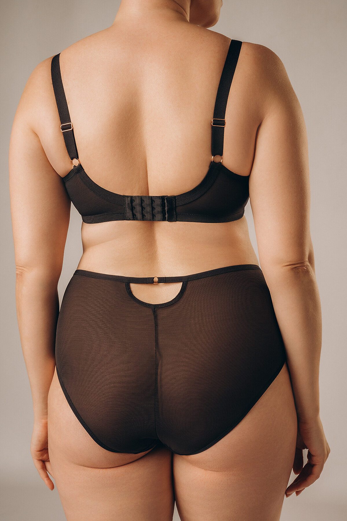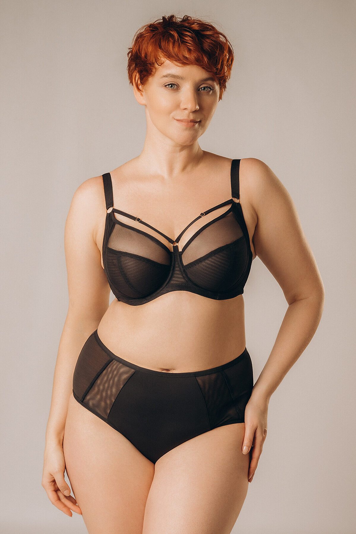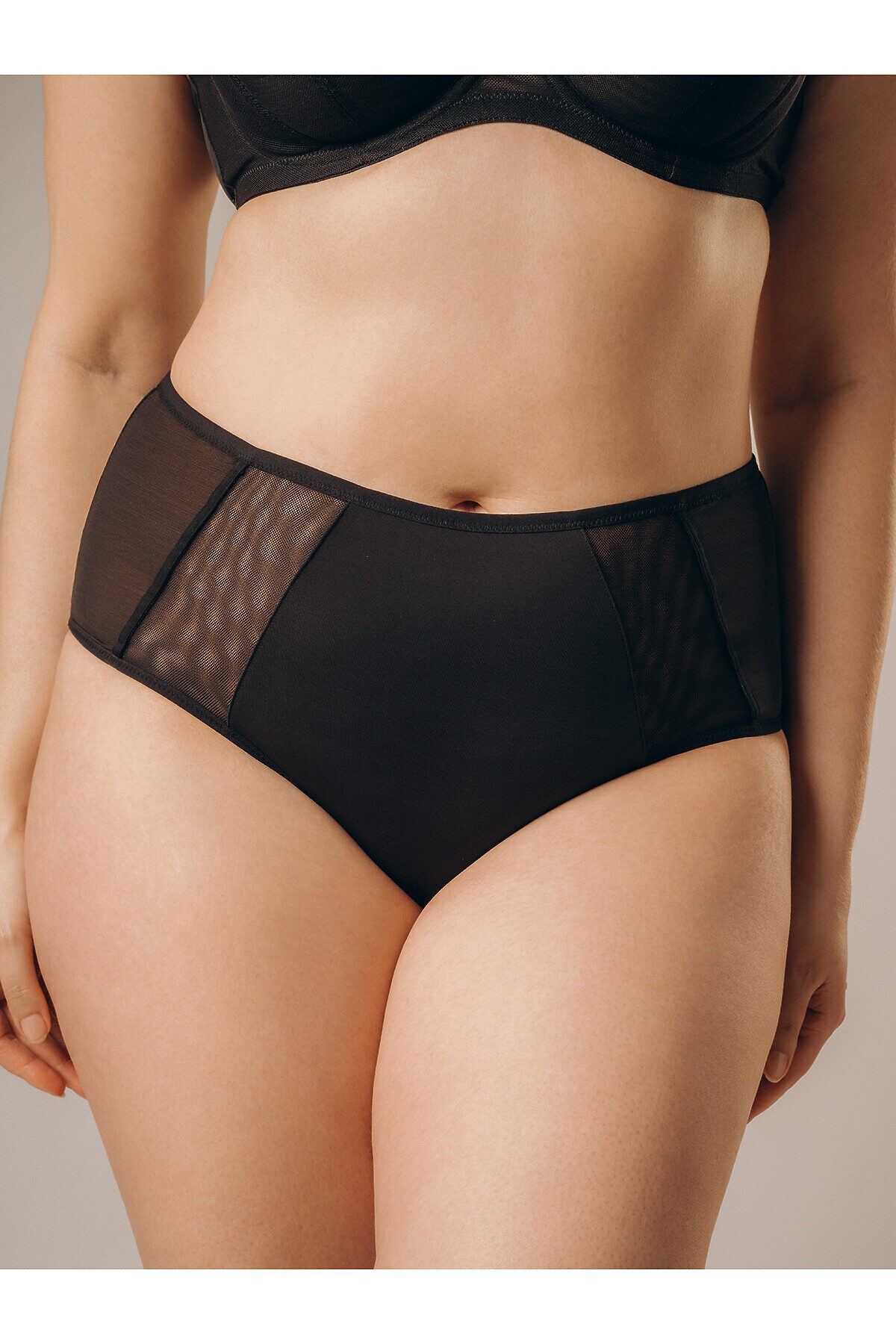 Комплект нижнего белья включает в себя бюстгальтер и трусы слипы. Бюстгальтер на косточках имеет сетчатые чашки без поролона и без эффекта Push-Up. Широкие бретели регулируются. Передняя часть бюстгальтера украшена декоративными лентами. Трусы слипы высокой посадки имеют мягкую эластичную резинку на талии и сетчатые вставки спереди. На задней части имеется полукруглый вырез. К бюстгальтеру идут трусы слипы размерами: 75C-M, 80C-L, 75D-M, 80D-L, 85C-XL, 85D-XL, 90C-XL, 85E-XXL, 90D-XXL, 90E-XXL.