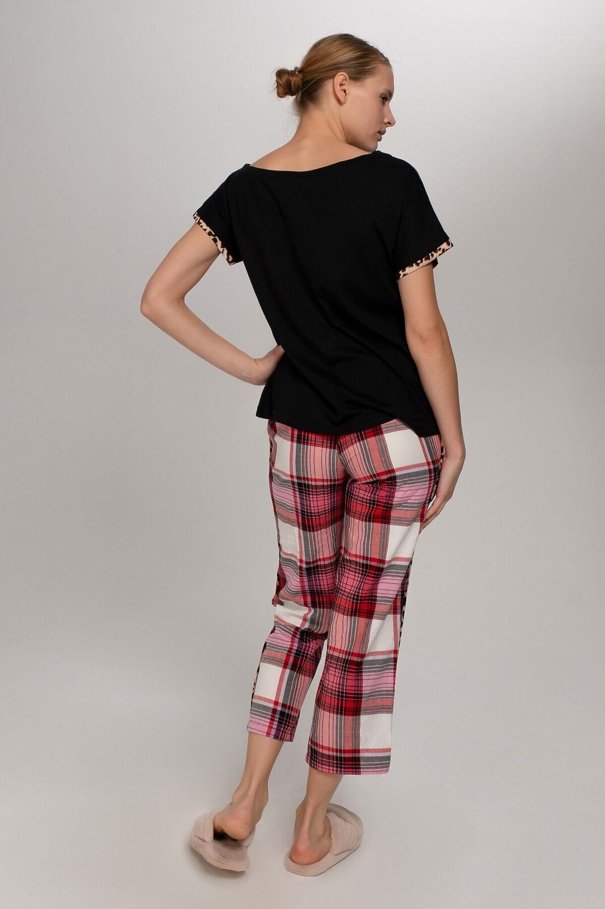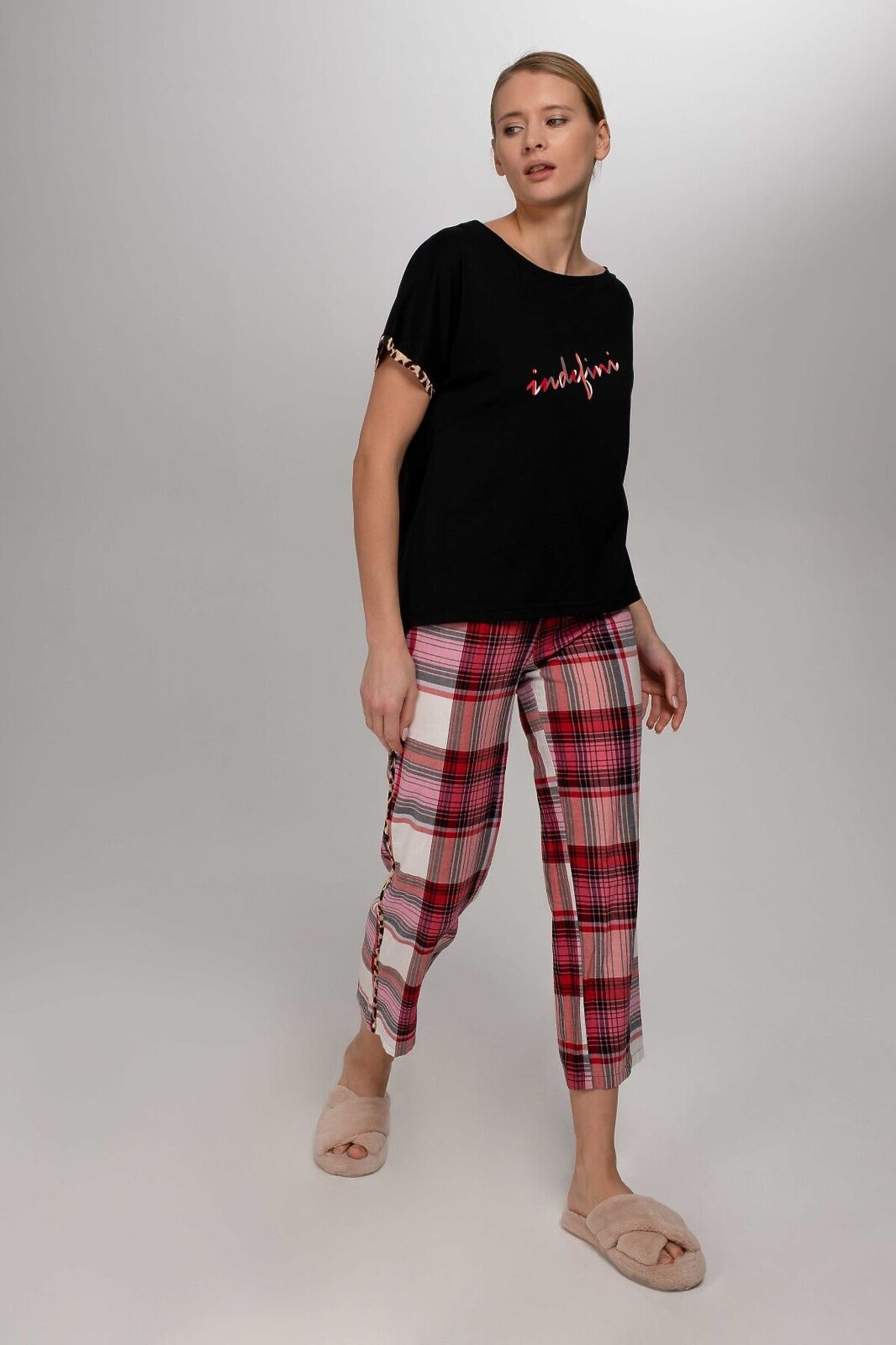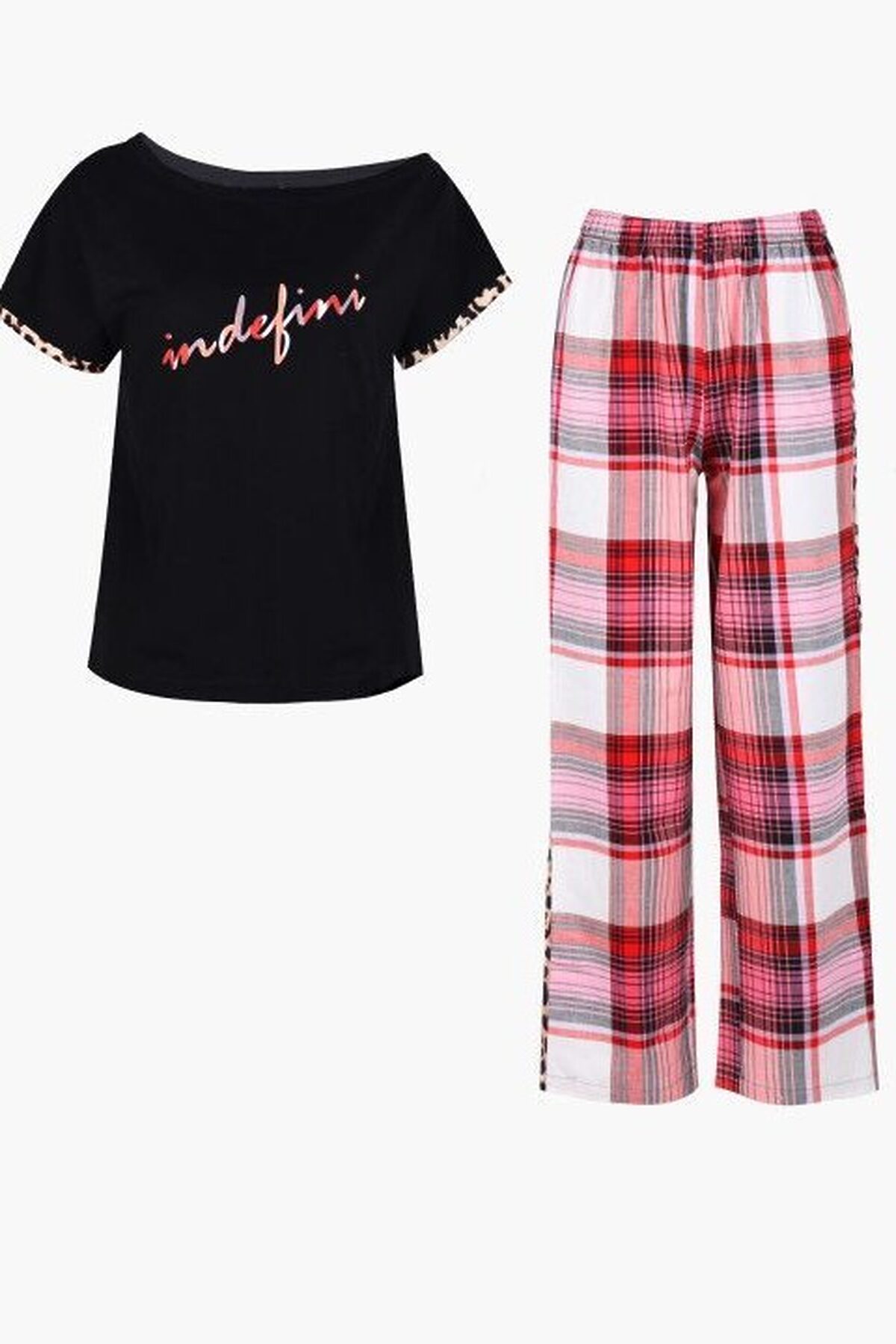 Домашний костюм от торговой марки Indefini. В комплекте футболка с брюками. Футболка из хлопка, черного цвета, с принтом-надписью, на одно плечо, с короткими рукавами, с обрамлением, прямая, свободного кроя. Брюки из хлопка, бело-красного цвета, с принтом в клетку, со вставками по бокам, широкие, прямые, свободного кроя.