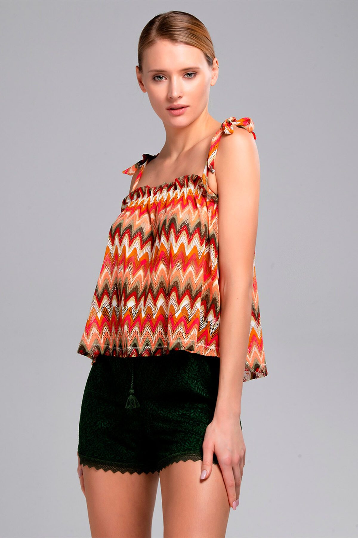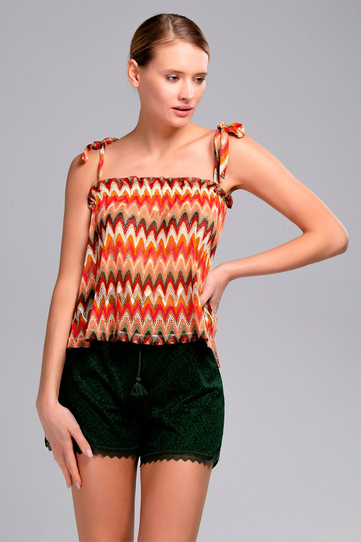 Пляжный костюм от торговой марки Индефини. В комплекте майка-топ с шортами. Майка выполнена из дышащей ткани, мультиколор с ярким принтом, на регулируемых бретелях, свободного кроя. Шорты выполнены из кружевной ткани, зеленого цвета, с обрамлением, на мягкой резинке с регулирующим поясом.