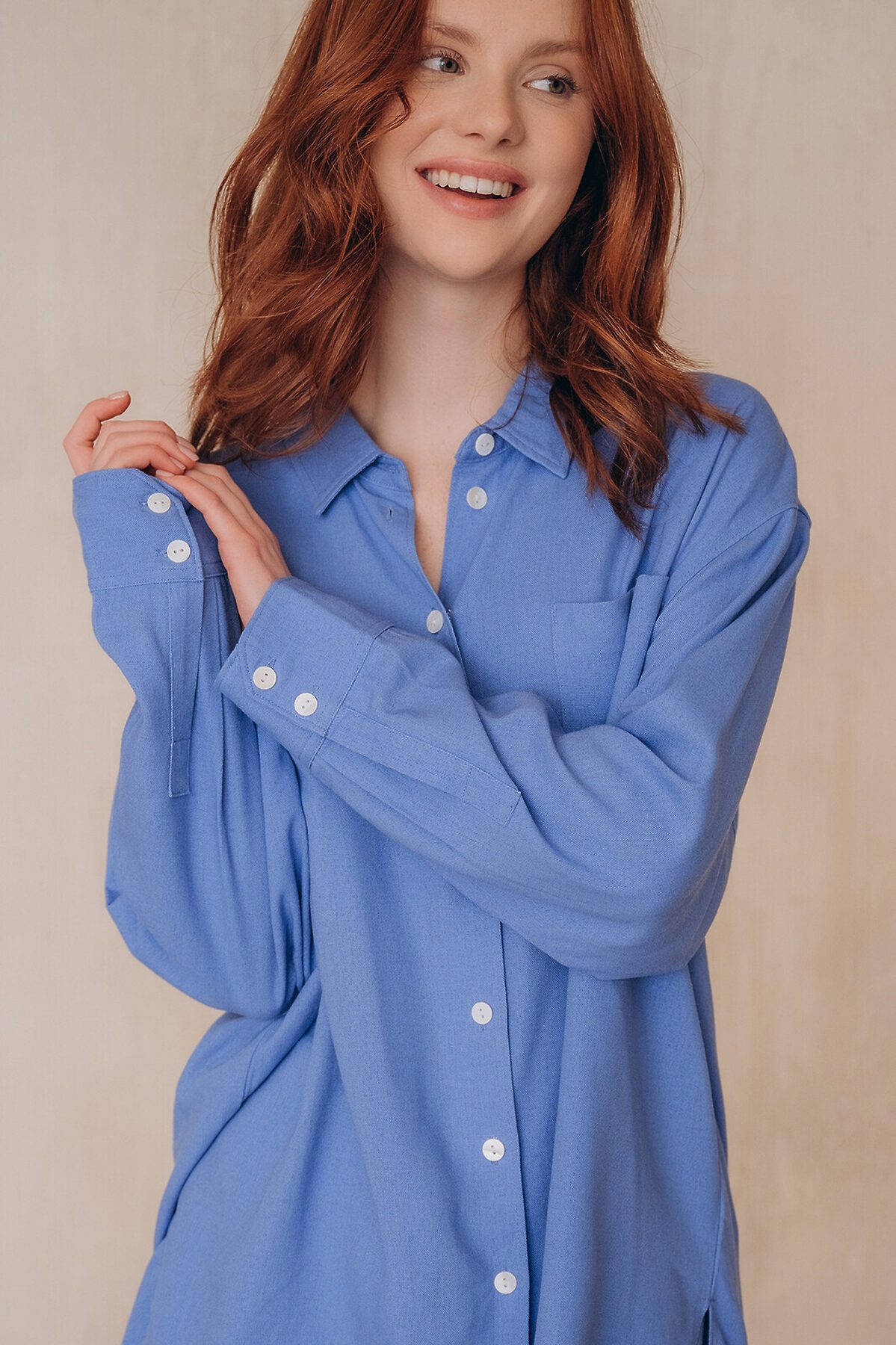 Костюм женский, изготовленный из смесовой ткани и выполненный в синем цвете, состоит из рубашки и шорт. Рубашка на пуговицах с длинными рукавами и отложным воротником имеет нагрудный карман. Манжеты застёгиваются на пуговицы. Шорты на мягкой широкой резинку имеют два боковых кармана. Спереди резинка украшена декоративной этикеткой с надписью.