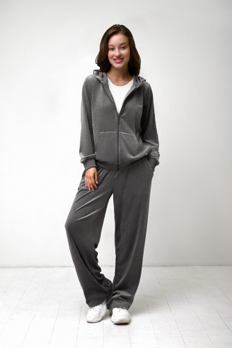 Пижама женская, изготовленная из полиэстера, выполнена с кофтой и брюками. Кофта на молнии, с длинными рукавами и капюшоном. На манжетах и на нижнем вырезе имеется резинка, по бокам имеются два кармана. Брюки прямого свободного кроя с широкой резинкой на талии и двумя боковыми карманами.