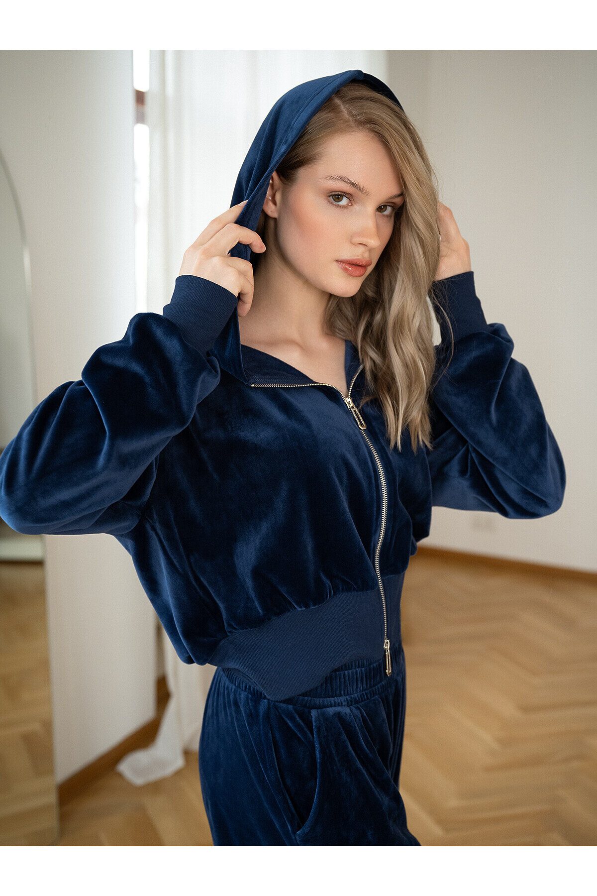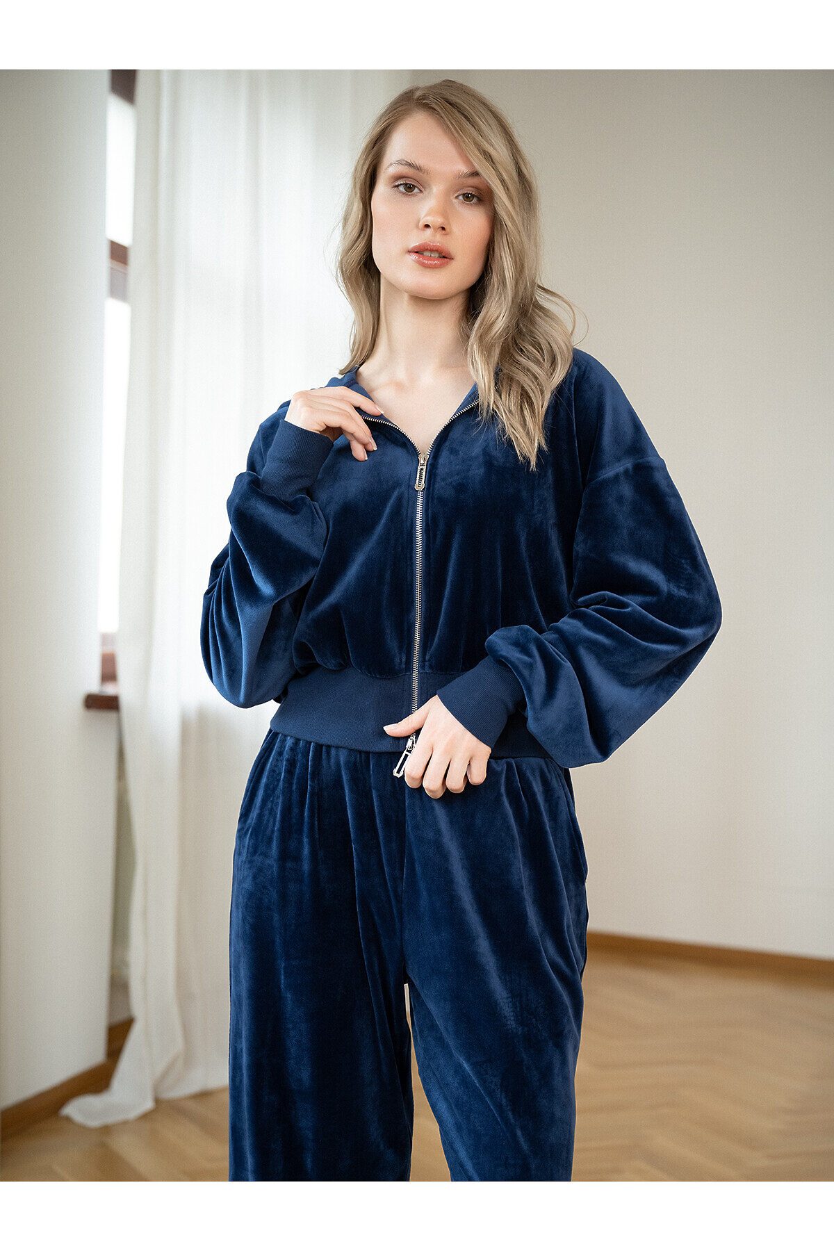 Женский велюровый костюм Indefini выполнен в насыщенном темно-синем цвете. Комплект состоит из укороченной толстовки на молнии с капюшоном и длинными рукавами, а также прямых брюк на мягкой эластичной резинке. Мягкий и приятный на ощупь велюр с добавлением эластана обеспечивает комфорт, свободу движений и уют в течение всего дня. Стильный дизайн и глубокий оттенок делают этот костюм отличным выбором для домашнего отдыха, прогулок или уютных вечеров. Идеальный вариант для тех, кто ценит комфорт, практичность и современный стиль.