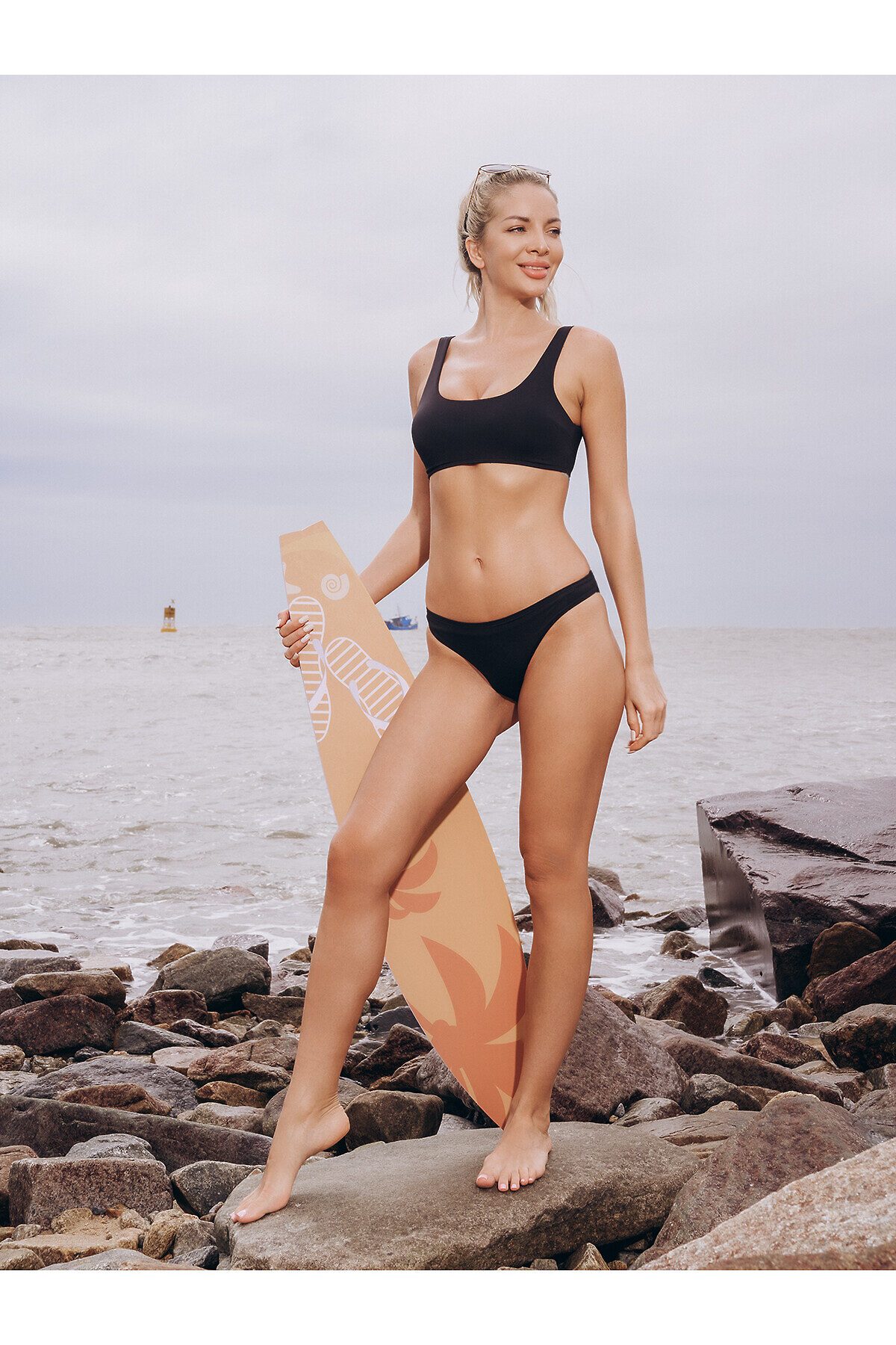 Раздельный купальник, изготовленный из полиамида, выполнен в классическом черном цвете. Купальник состоит из бюстгальтера и трусов слипов. Бюстгальтер без косточек имеет поролоновые чашки без Push-Up. Трусы слипы имеют среднюю посадку и мягкую эластичную резинку на талии.