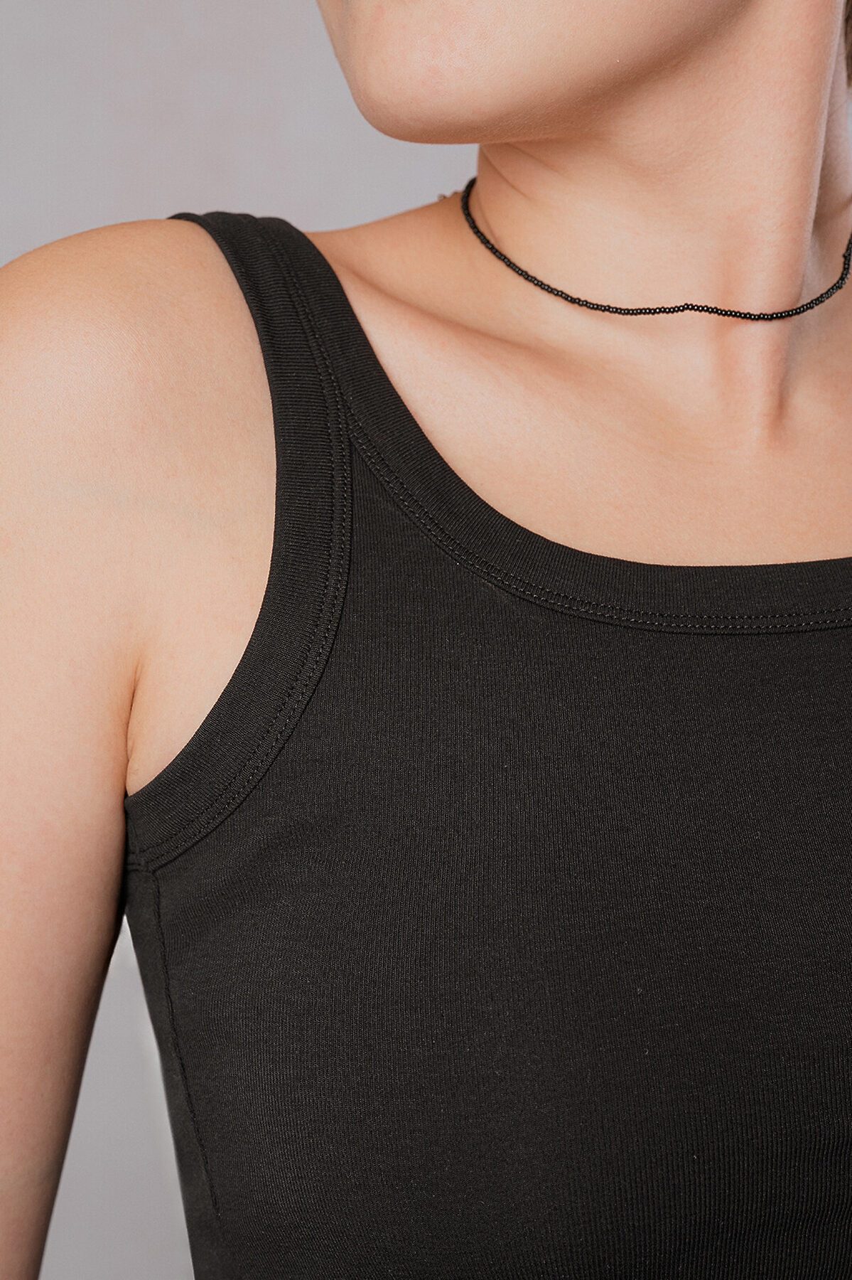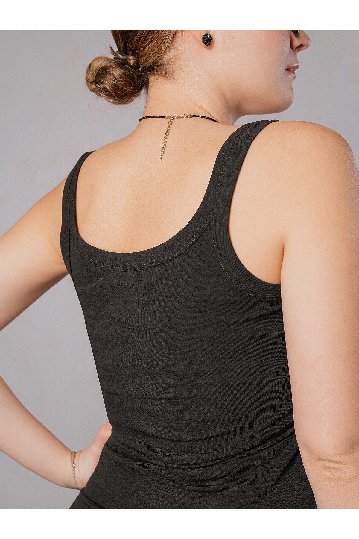 Майка женская изготовлена из хлопкового трикотажа и выполнена в классическом черном цвете. Она имеет круглый вырез и широкие бретели, обрамленные каймой в цвет ткани. Майка плотно облегает фигуру, не сковывая движений.